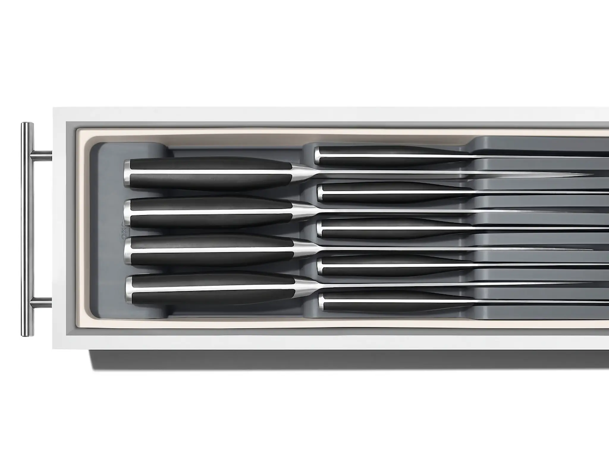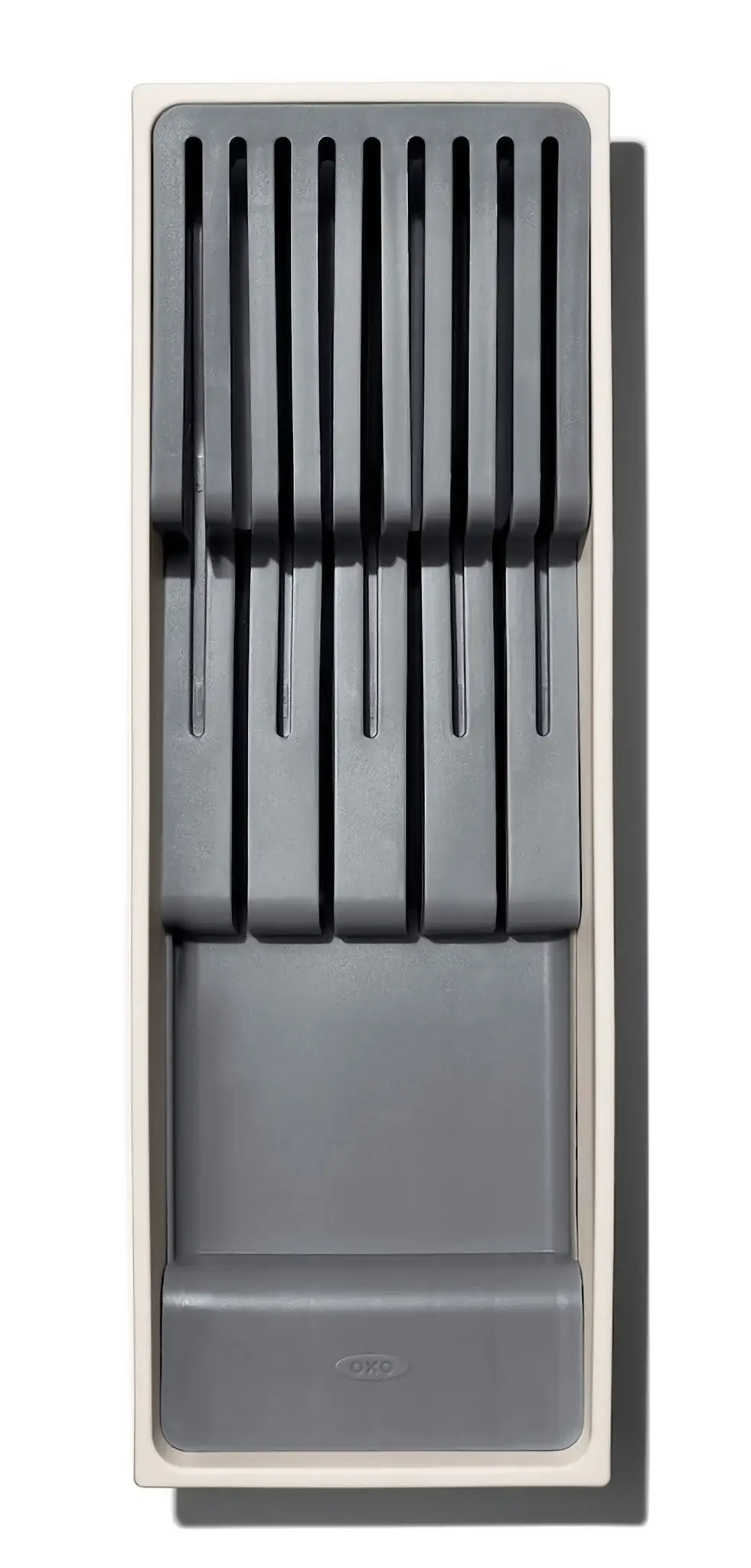 Prezentowany organizer z linii Good Grips o wymiarach 41,2 x 14,1 x 5,9 cm (dł. x szer. x wys.) i neutralnym szarym kolorze wykonano z tworzywa sztucznego. Idealnie wpasuje się w wiele wnętrz, umożliwiając bezpieczne i wygodne przechowywanie noży. Kompaktowa konstrukcja dobrze przylega do ścianek szuflady. Odpowiednią stabilność zapewniają również antypoślizgowe nóżki. Produkt ma dwa poziomy, mieści 5 małych i 4 duże noże. Organizer przeznaczony jest do mycia ręcznego - dla ułatwienia tackę można wyjąć.