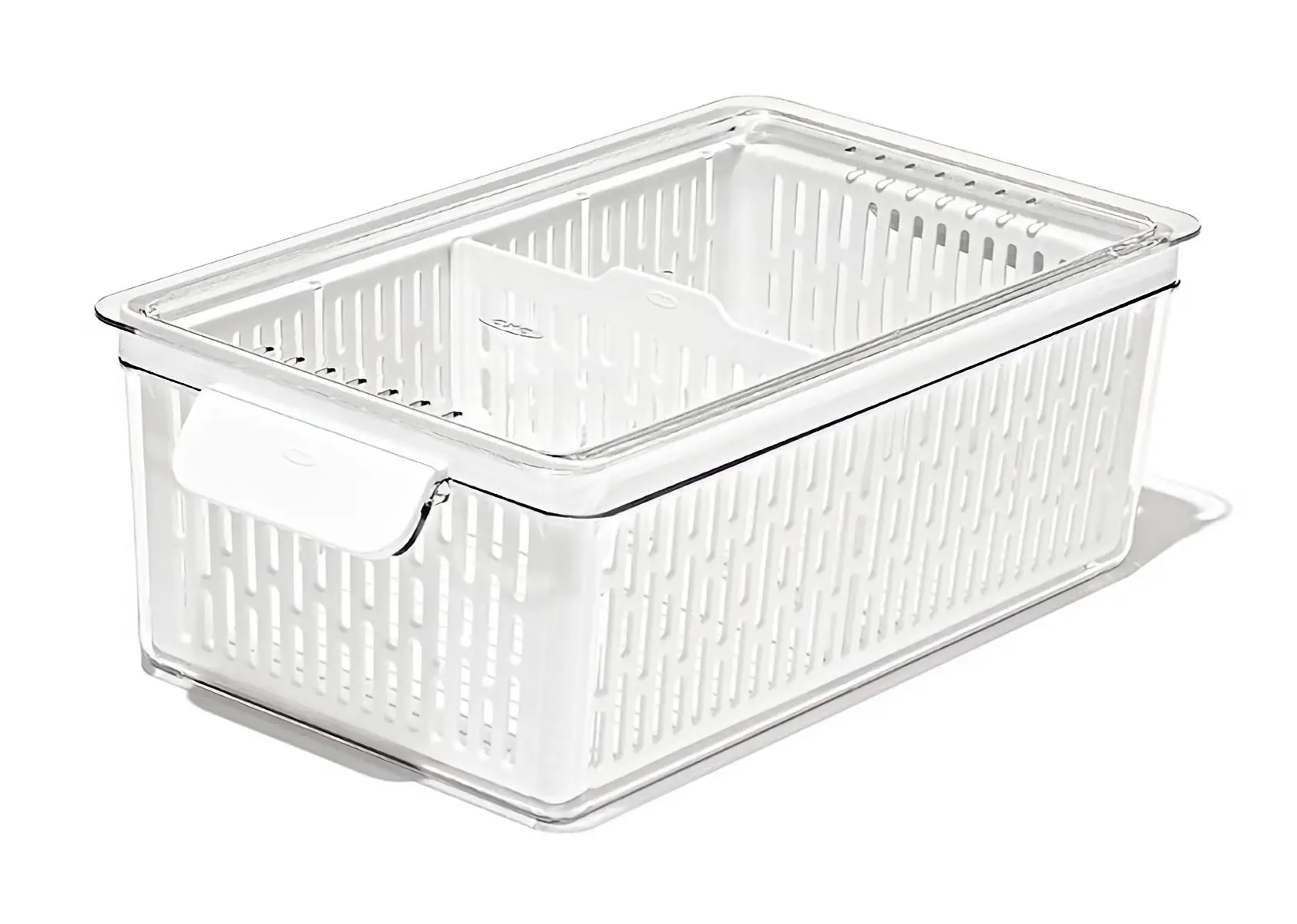 Prezentowany pojemnik na warzywa Good Grips w rozmiarze M wykonano w całości z tworzywa sztucznego w neutralnym, białym kolorze, dzięki czemu wpasuje się w niemal każdą przestrzeń, ułatwiając przechowywanie żywności. Wyposażono go wyjmowany koszyk oraz ruchomy separator dla łatwej segregacji zawartości. Pojemnik posiada również boczne uchwyty ułatwiające przenoszenie oraz pokrywkę chroniącą przed utratą świeżości. Produkt jest łatwy do przechowywania. Nie sprawi problemów także w czyszczeniu - można go myć w zmywarce.