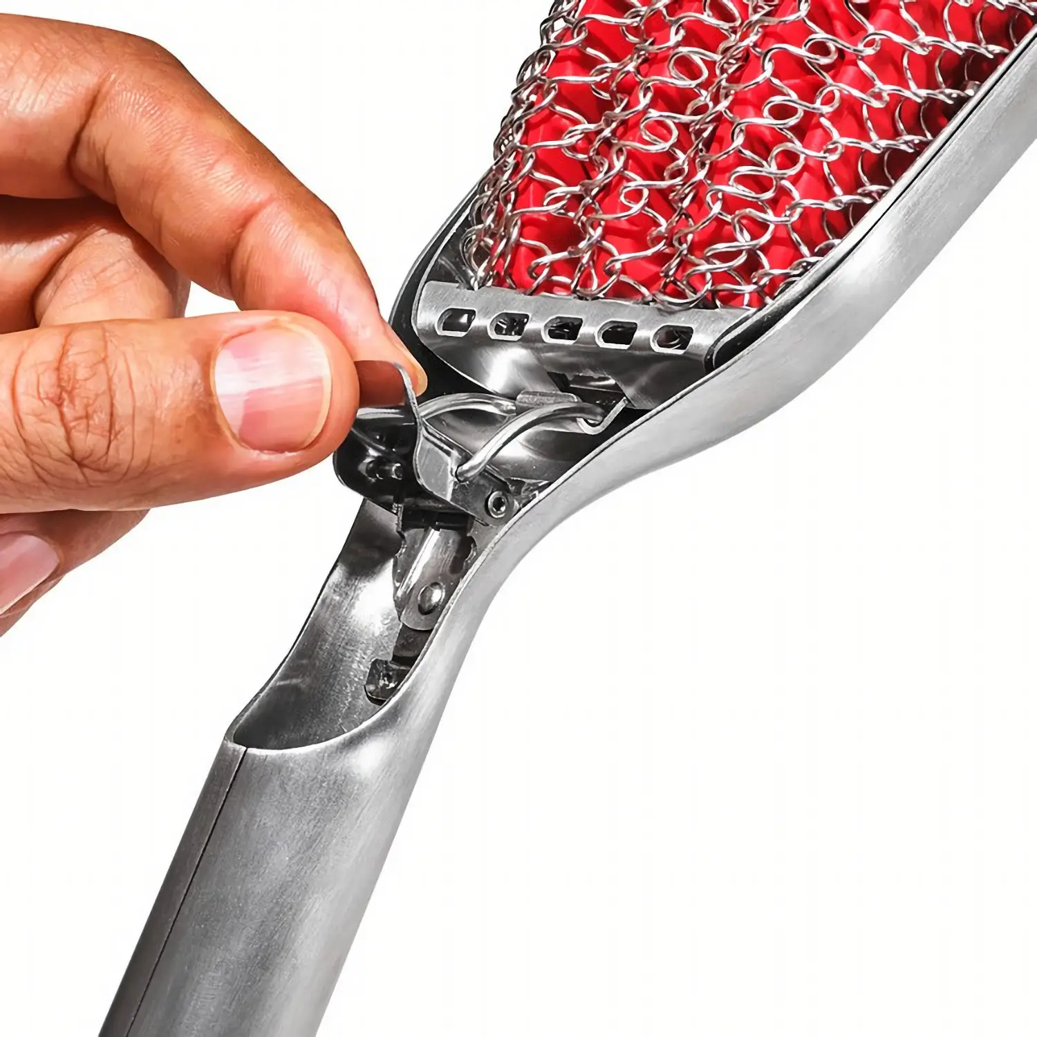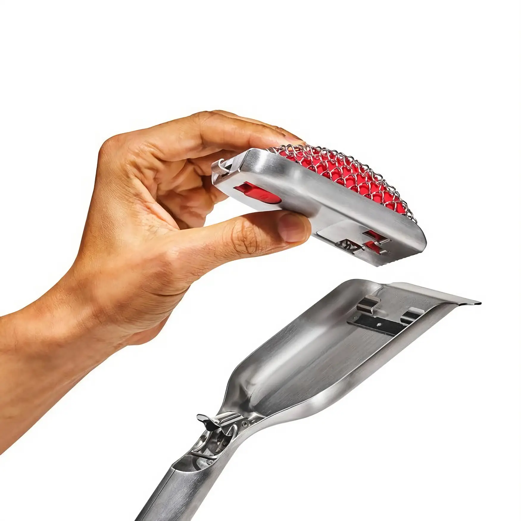 Prezentowany skrobak 2w1 do czyszczenia rusztów grilla z kolekcji Good Grips o wymiarach 51,3 x 7,8 cm (dł. x szer.) idealnie nada się do prawie wszystkich ich rodzajów (wyjątkiem są te ceramiczne). Wykonany został ze stali nierdzewnej, silikonu i tworzywa sztucznego. Jego długa rączka wygodnie leży w dłoni i zapobiega poparzeniom. Praktyczna głowica jest wyjmowana, przez co łatwo jest ją myć. Dodatkowo ułatwia to fakt, że produkt nadaje się do zmywarki. Ponadto skrobak nie sprawia problemów w przechowywaniu - praktyczna pętelka na końcu pozwala na zawieszenie go na grillu lub haczyku kuchennym.