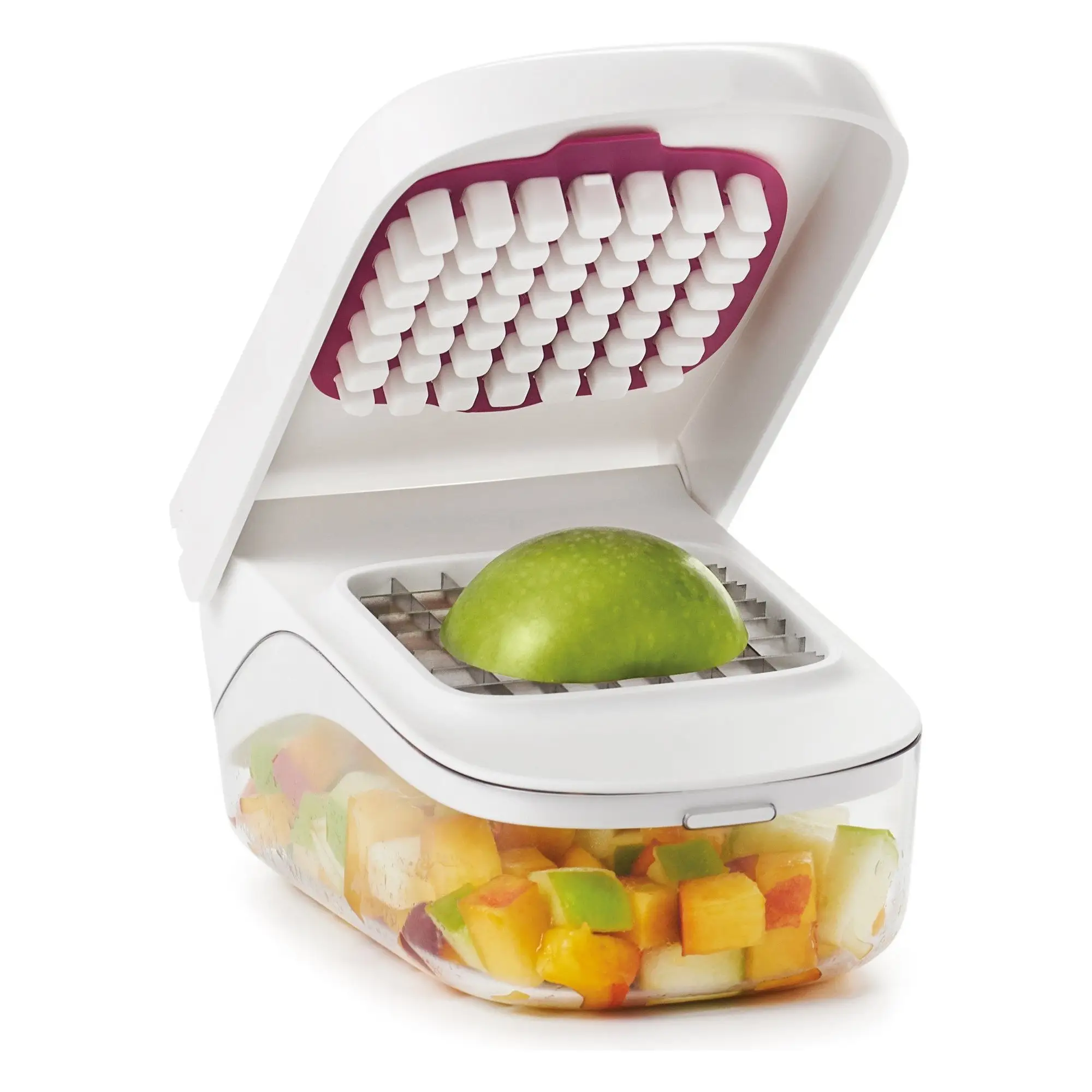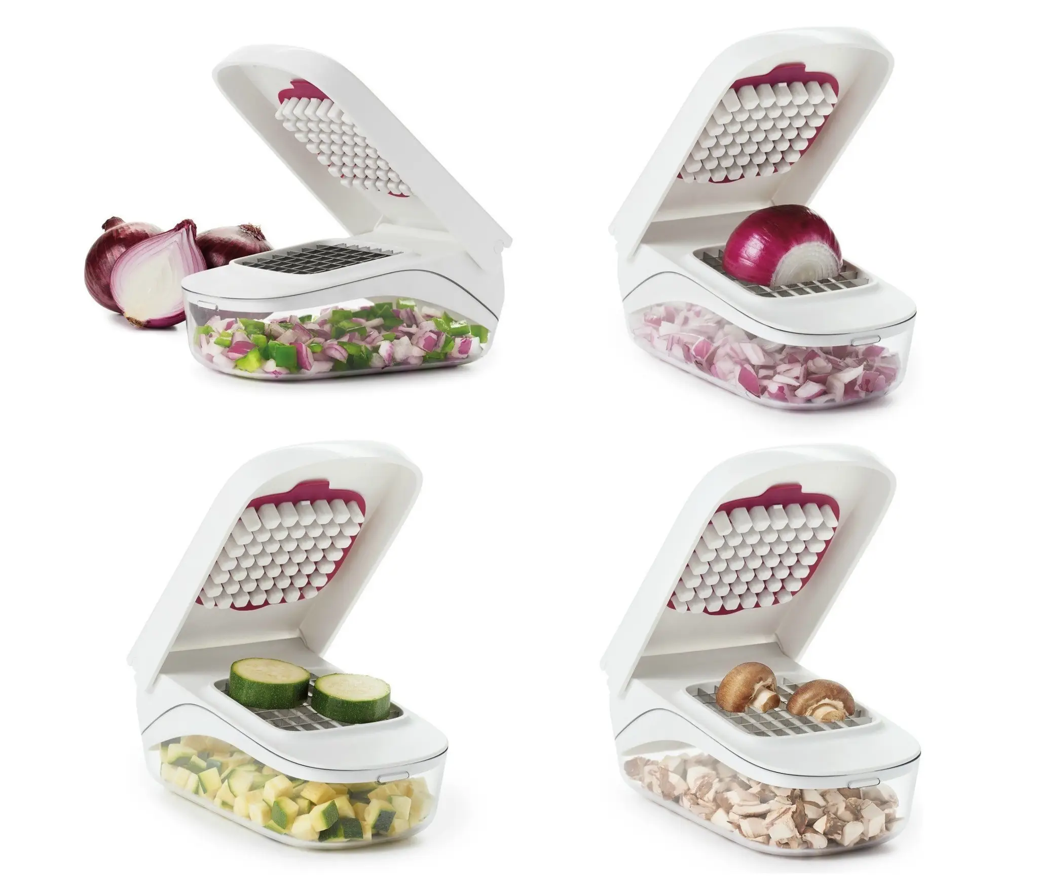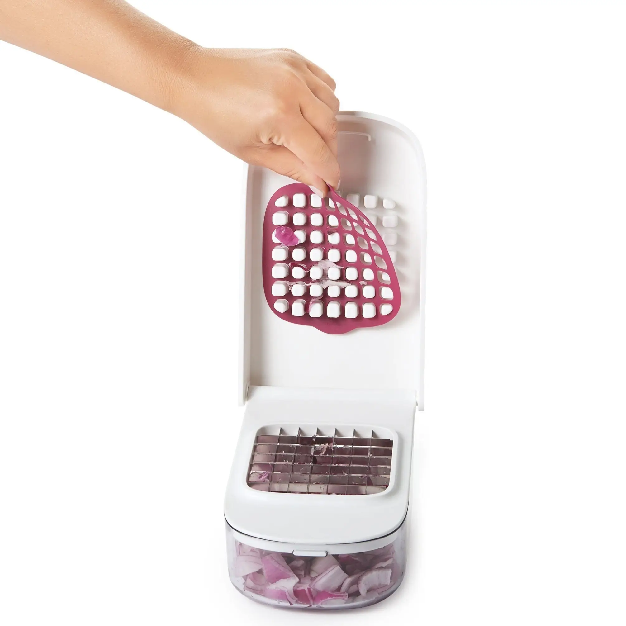 Antypoślizgowa podstawa zapobiega przesuwaniu się szatkownicy podczas użytkowania. Ostrze ze stali nierdzewnej kroi produkty na słupki lub kostkę, które wpadają prosto do przezroczystego pojemnika o pojemności 560 ml. Otwór w pojemniku szatkownicy sprzyja łatwemu wysypywaniu posiekanych produktów, bez konieczności otwierania urządzenia. Wyjmowana, silikonowa kratka ułatwia czyszczenie urządzenia. Do produktu dołączona została ilustrowana instrukcja obsługi.