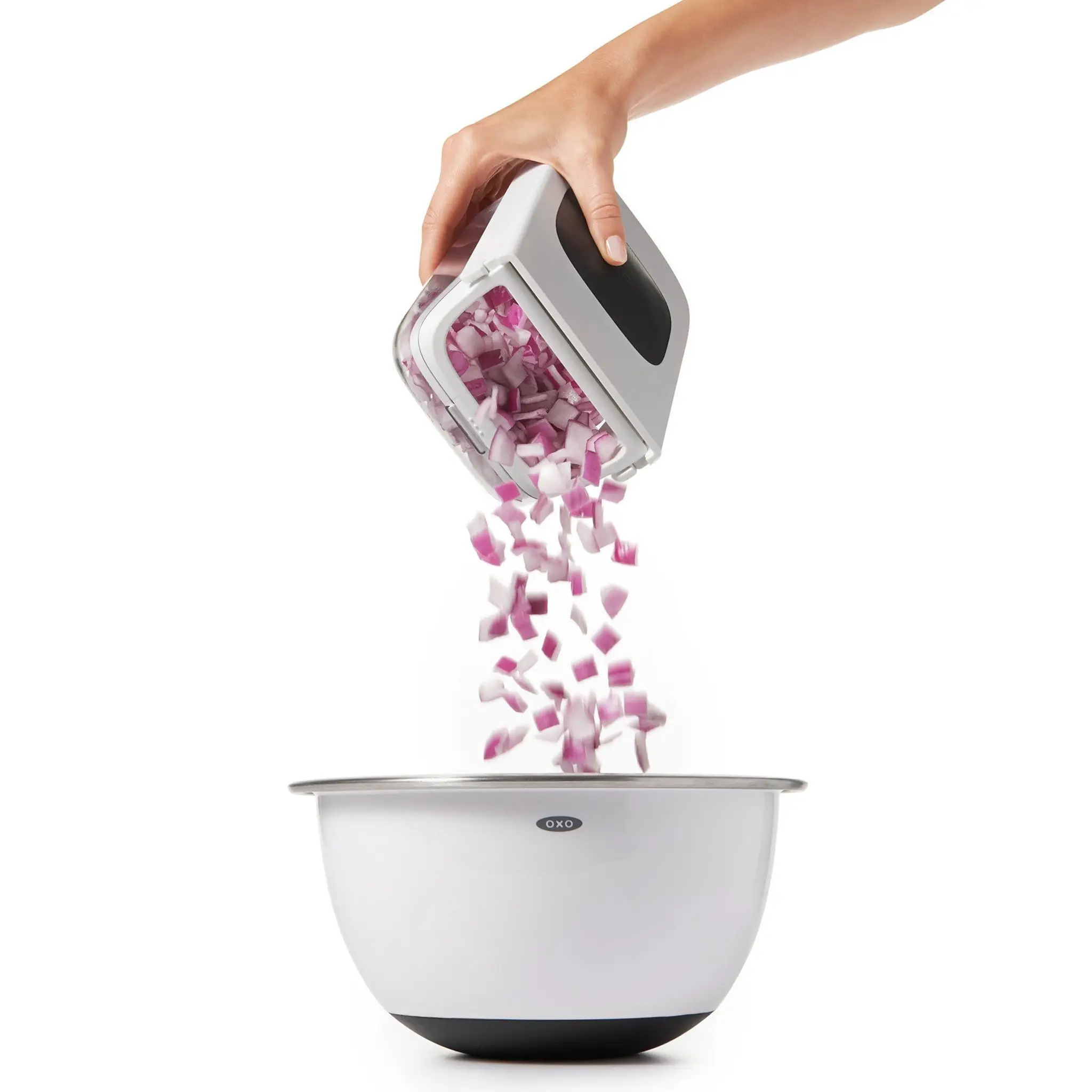 Szatkownica marki Oxo z kolekcji Good Grips to sposób na ekspresowe pokrojenie warzyw i owoców - szybko, wygodnie i bezpiecznie. Pokrywka szatkownicy wyposażona została w nakładkę, która zapobiega ześlizgiwaniu się dłoni podczas nacisku, który zwiększony jest dodatkowo przez optymalny kąt nachylenia pokrywy.