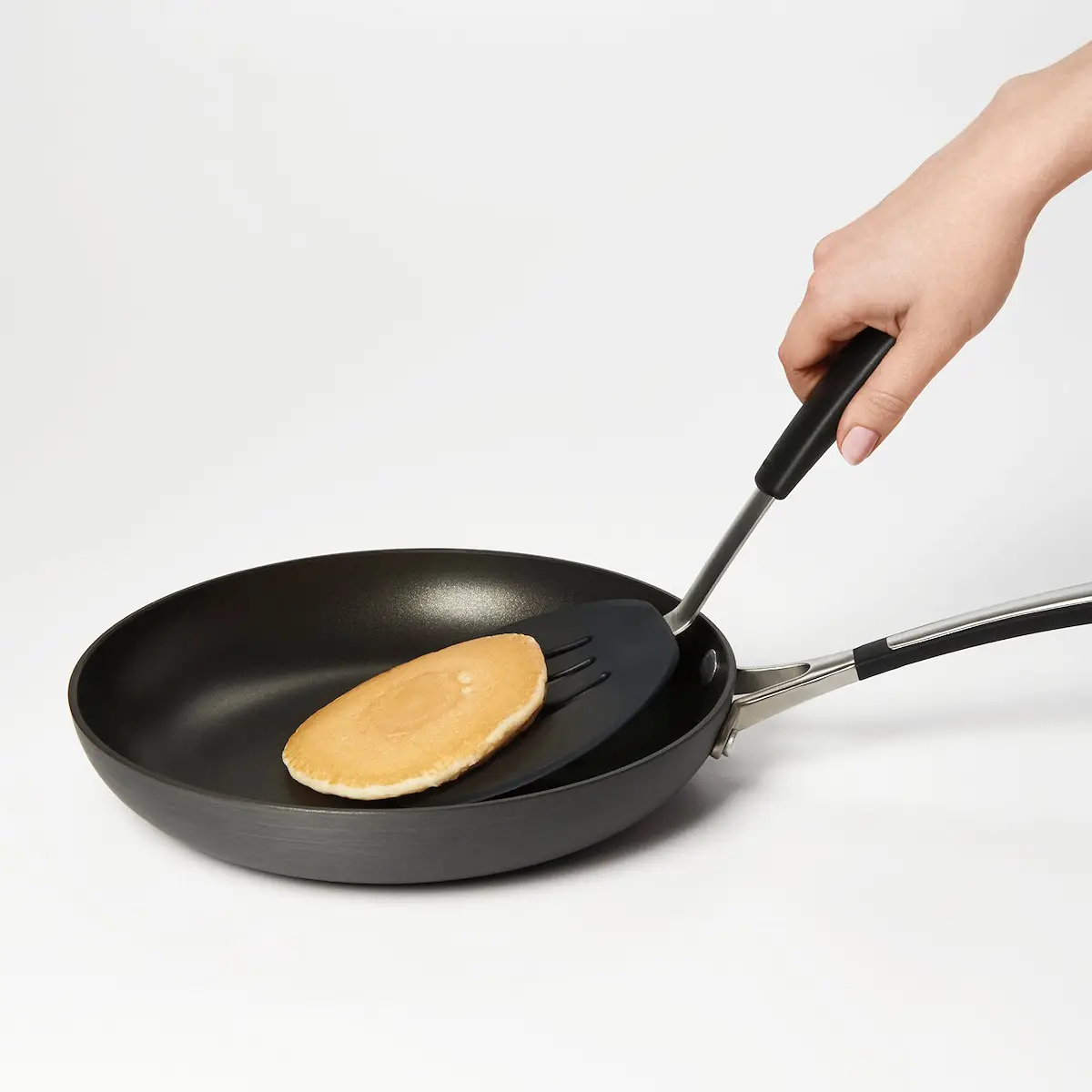 Szpatuła do naleśników sprawdzi się świetnie do odwracania i serwowania. Płaska, idealnie wyprofilowana końcówka z łatwością wsuwa się pod potrawy. Narzędzia kuchenne Flex marki Oxo z kolekcji Good Grips łączą wytrzymałość stali nierdzewnej z elastycznością silikonu. Elastyczne końcówki ze stali powleczone wysokiej jakości silikonem odpornym na temperaturę do 315 stopni C, przeznaczone są do naczyń teflonowych, ceramicznych i wszelkich powierzchni z powłoką typu non-stick.