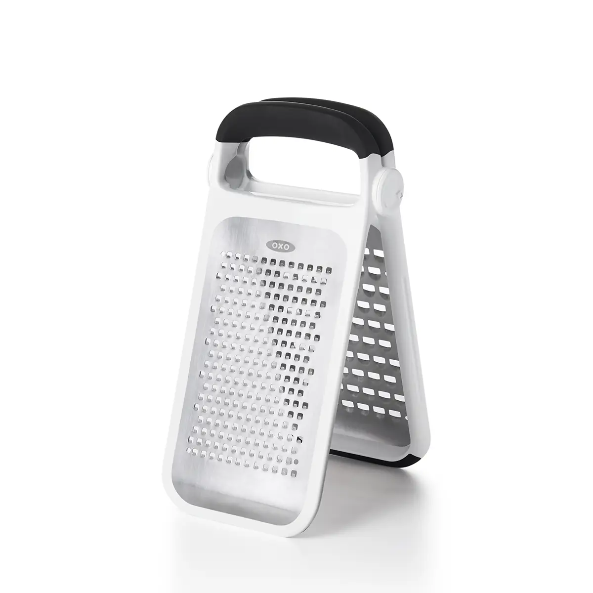 Wygodna w przechowywaniu dwustronna tarka marki OXO zajmuje niewiele miejsca po złożeniu. Jest uniwersalna, ponieważ posiada dwa rodzaje ostrzy: