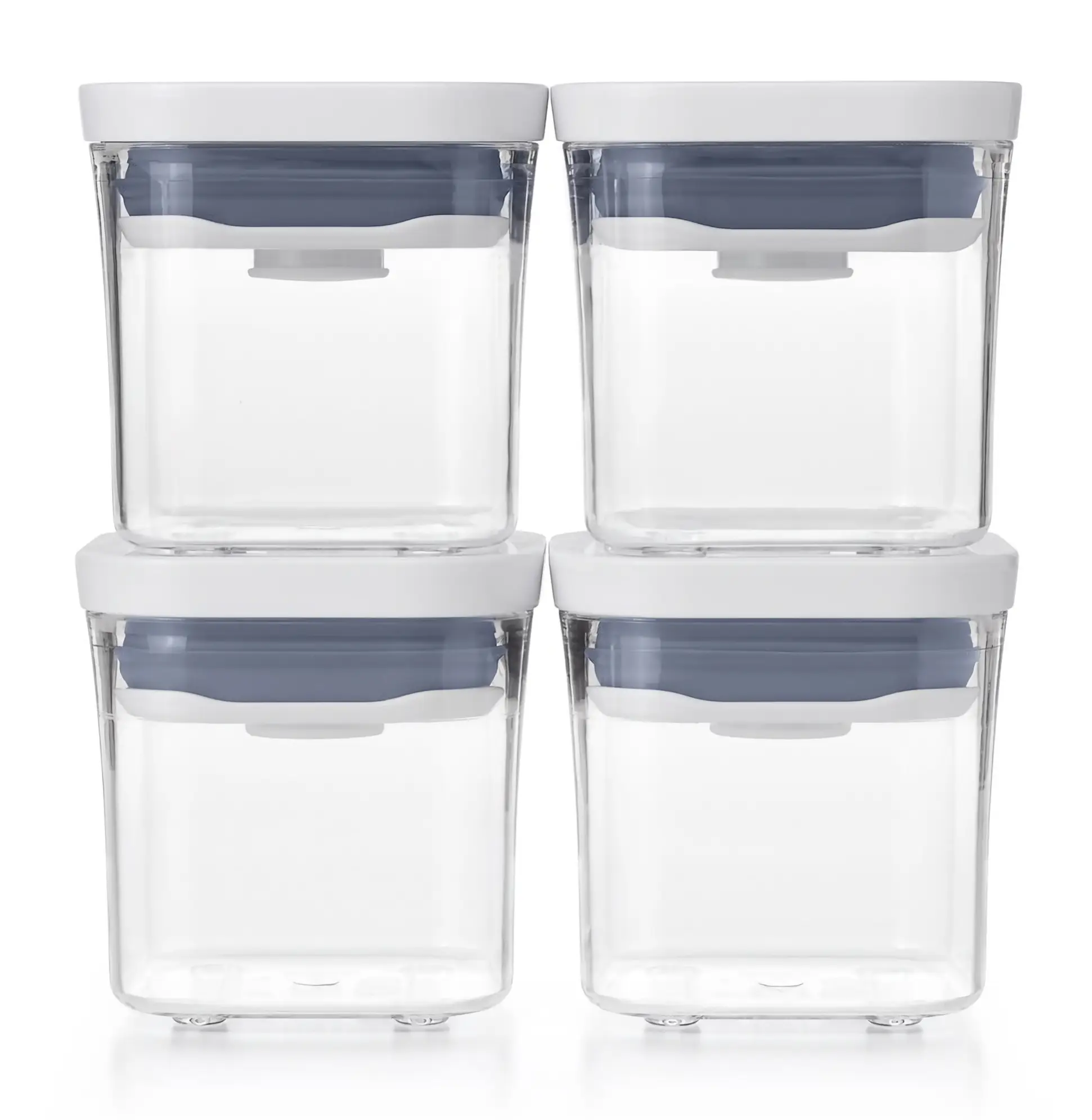Prezentowany zestaw 4 pojemników o kwadratowej podstawie, pojemności 0,2 L i wymiarach 8,3 x 8,3 x 7,9 cm (szer. x gł. x wys.) każdy wykonano z tworzywa sztucznego bez BPA. Doskonale sprawdzi się do przechowywania i dozowania suchych produktów takich jak m.in. ciastka, przekąski, płatki, ryż. Pojemniki posiadają pokrywki z uszczelniającymi przyciskami i kanciaste boki ułatwiające przesypywanie. Dzięki możliwości ustawiania ich jeden na drugim oszczędzić będzie można miejsce na blacie lub w szafkach, co ma znaczenie zwłaszcza w małych kuchniach. Zestaw nie sprawi problemów również w utrzymaniu w czystości - wszystkie elementy można myć zarówno ręcznie jak i z pomocą zmywarki (na górnej półce).