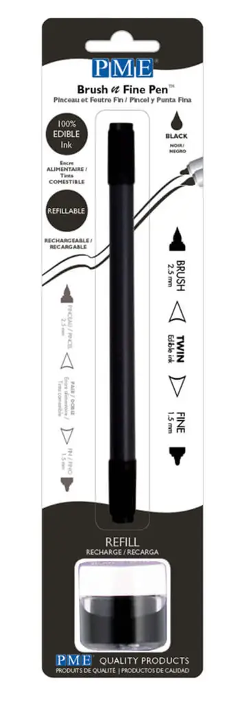 Dwustronny pisak spożywczy, to praktyczne narzędzie do precyzyjnego dekorowania wypieków. Wyposażony w dwie końcówki – pędzelek o grubości 2.5mm oraz flamaster 1.5mm – umożliwia tworzenie zarówno delikatnych linii, jak i nieco szerszych zdobień.