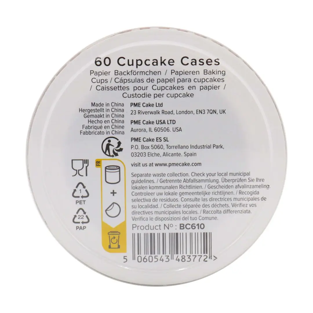W zestawie znajduje się 60 sztuk papilotek o wymiarach 5x3cm. Wykonane z trwałego materiału odpornego na tłuszcz i wysoką temperaturę, zachowują swój kolor i formę podczas pieczenia.