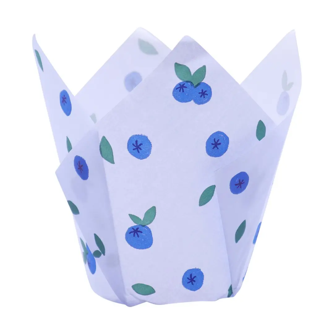 Kształt przypominający kwiat tulipana dodaje babeczkom elegancji i pozwala na pieczenie nieco wyższych wypieków. Wzór z borówkami nadaje świeżości i lekkości, przyciągając wzrok i wprowadzając pogodny nastrój na stole.