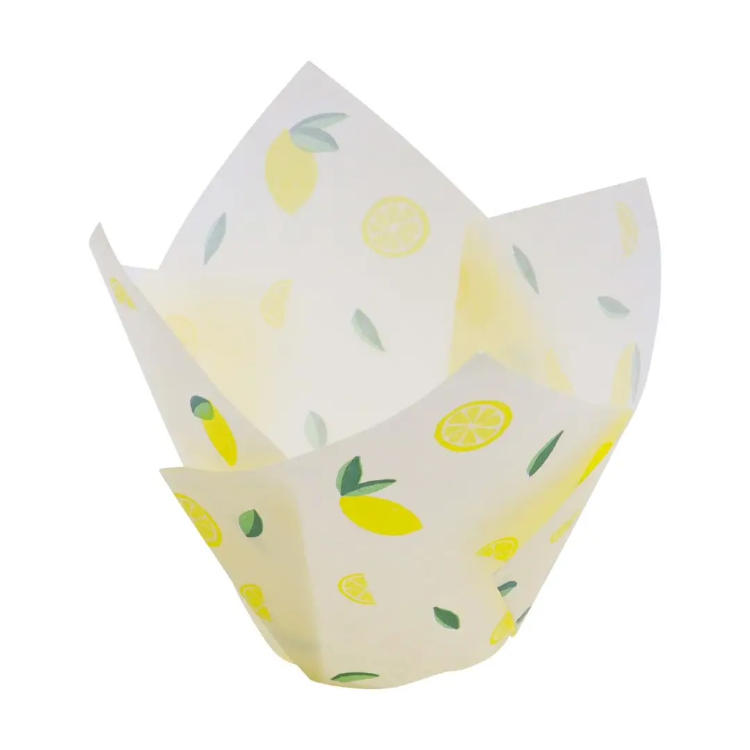 Kształt przypominający kwiat tulipana dodaje babeczkom elegancji i pozwala na pieczenie nieco wyższych wypieków. Wzór z cytrynkami nadaje świeżości i lekkości, przyciągając wzrok i wprowadzając pogodny nastrój na stole.