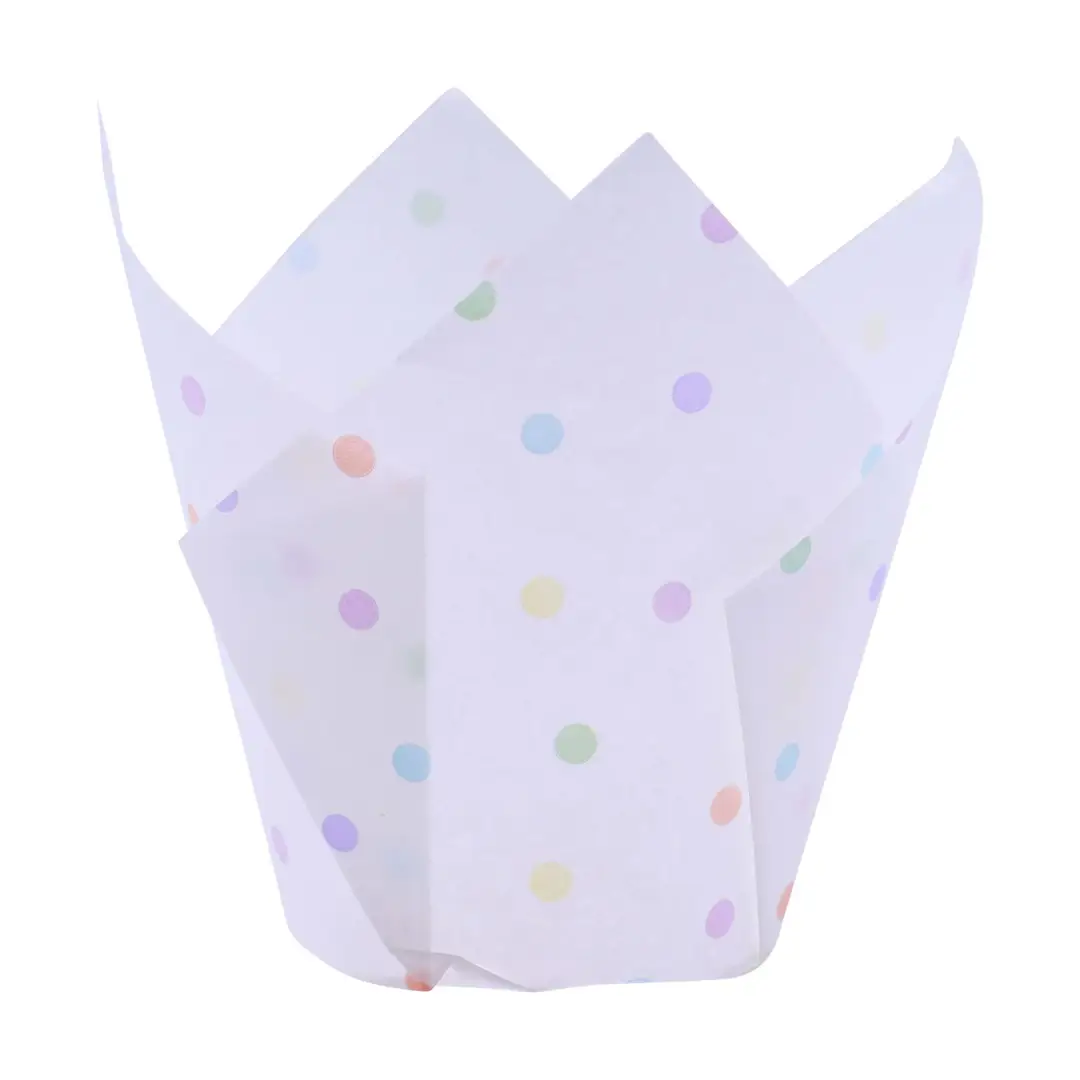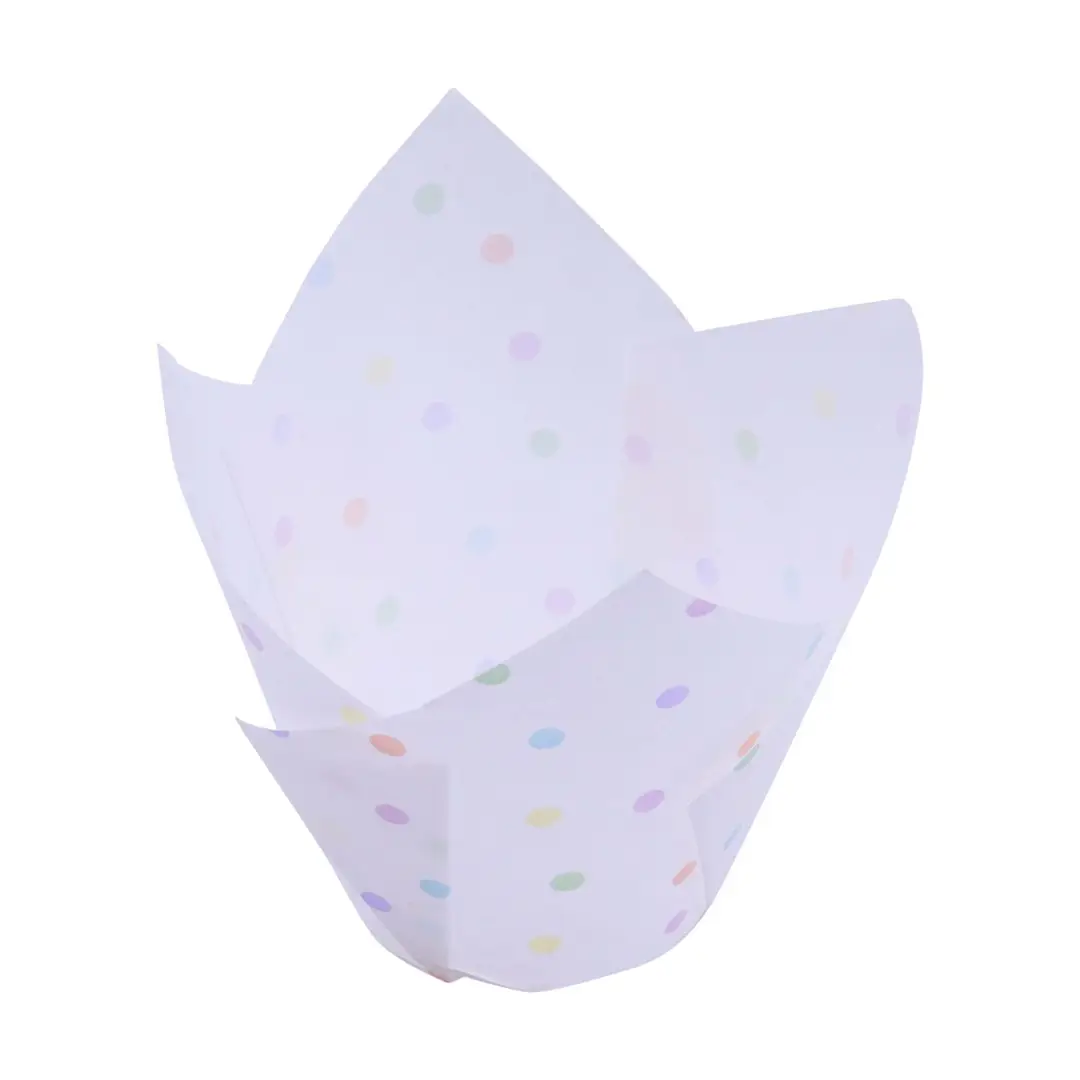 Tulipanowy kształt nadaje babeczkom elegancji i pozwala na przygotowanie nieco wyższych wypieków. Białe tło ozdobione drobnymi groszkami w różnych kolorach tworzy pogodny, wiosenny klimat i pięknie prezentuje się na stole w towarzystwie innych słodkości.
