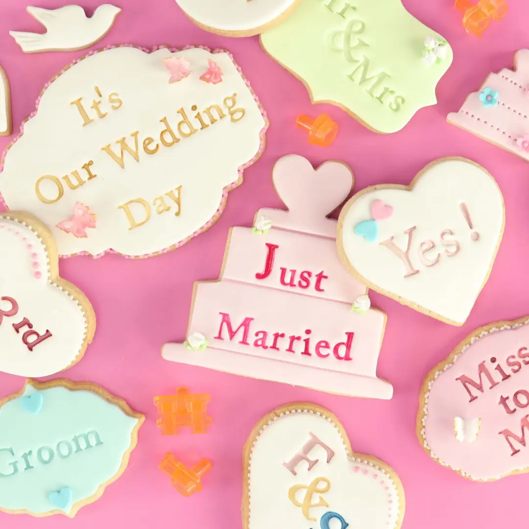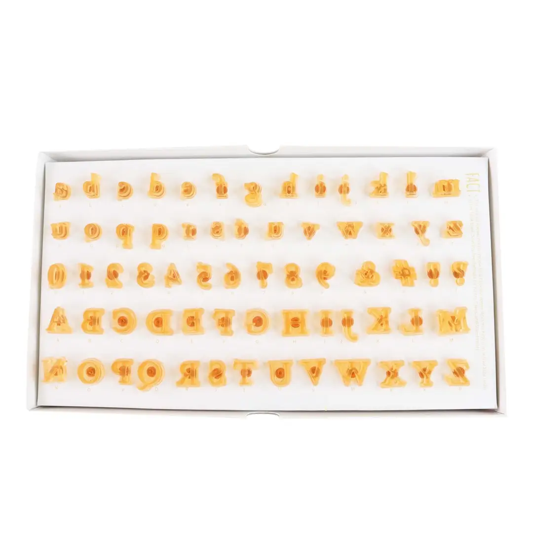 Zestaw foremek do tworzenia napisów w postaci pomarańczowych pieczątek, to aż 66 elementów, które pozwalają na wygodne i estetyczne odciskanie liter, cyfr oraz symboli w masie cukrowej, lukrze, marcepanie czy glinie. W zestawie znajdują się wszystkie niezbędne znaki: 26 wielkich liter, 26 małych liter, cyfry od 0 do 9 oraz symbole &, ?, #.