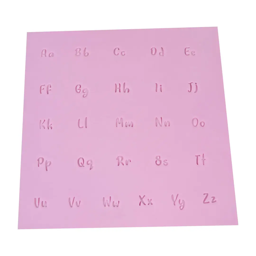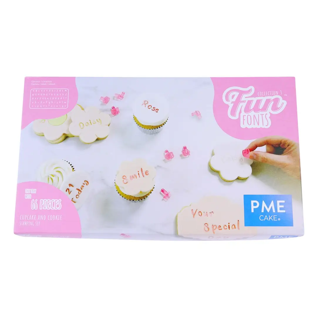 Zestaw foremek do tworzenia napisów w postaci różowych pieczątek, to aż 66 elementów, które pozwalają na wygodne i estetyczne odciskanie liter, cyfr oraz symboli w masie cukrowej, lukrze, marcepanie czy glinie. W zestawie znajdują się wszystkie niezbędne znaki: 26 wielkich liter, 26 małych liter, cyfry od 0 do 9 oraz symbole &, ?, #.
