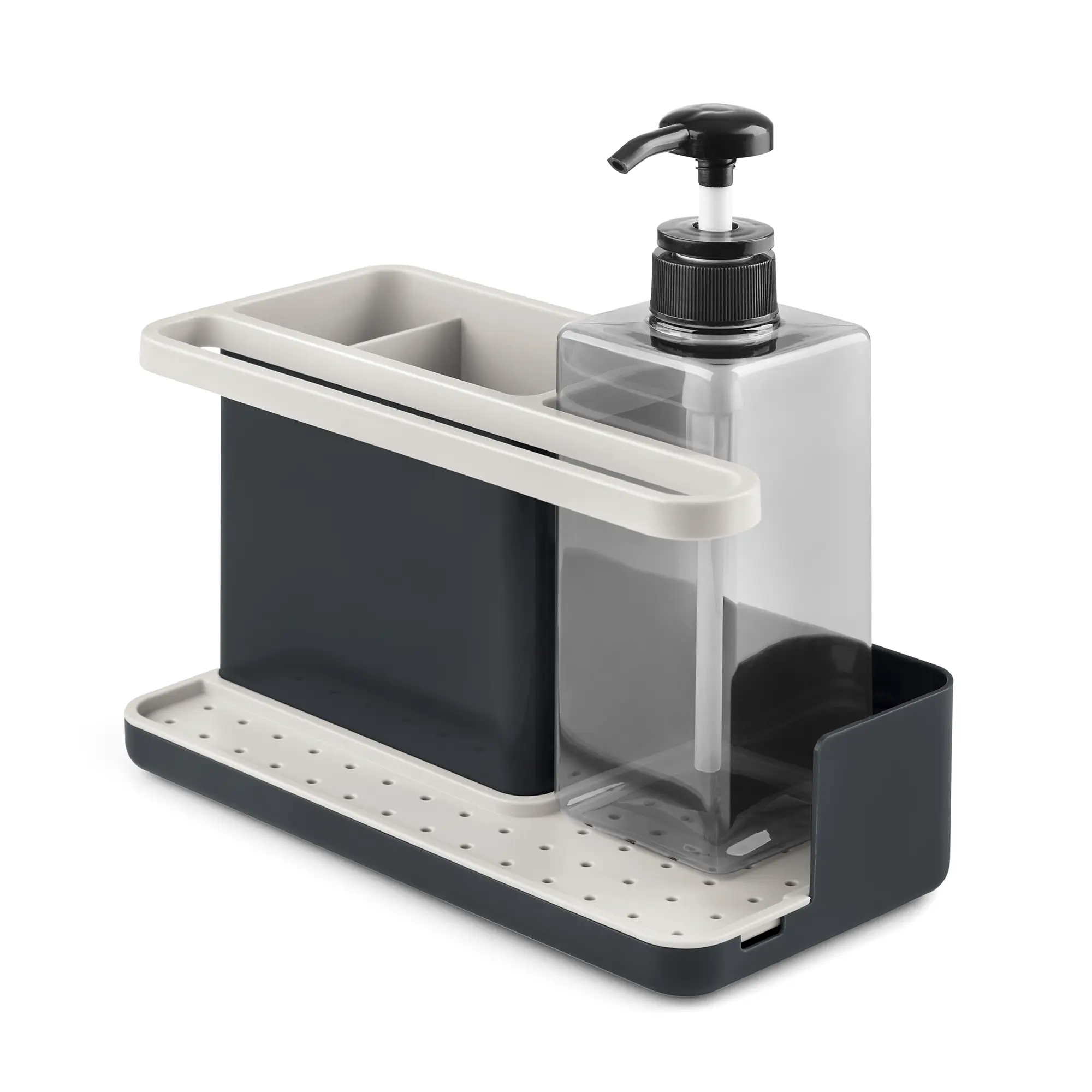 Organizer wyposażony jest w ruchome przegródki, które pozwalają na zorganizowanie gąbek, szczotek, płynów do mycia naczyń i innych akcesoriów kuchennych w jednym, łatwo dostępnym miejscu. Ponadto, praktyczna tacka ociekowa umożliwia bezpieczne gromadzenie nadmiaru wody, minimalizując ryzyko dostania się jej na powierzchnię blatu.