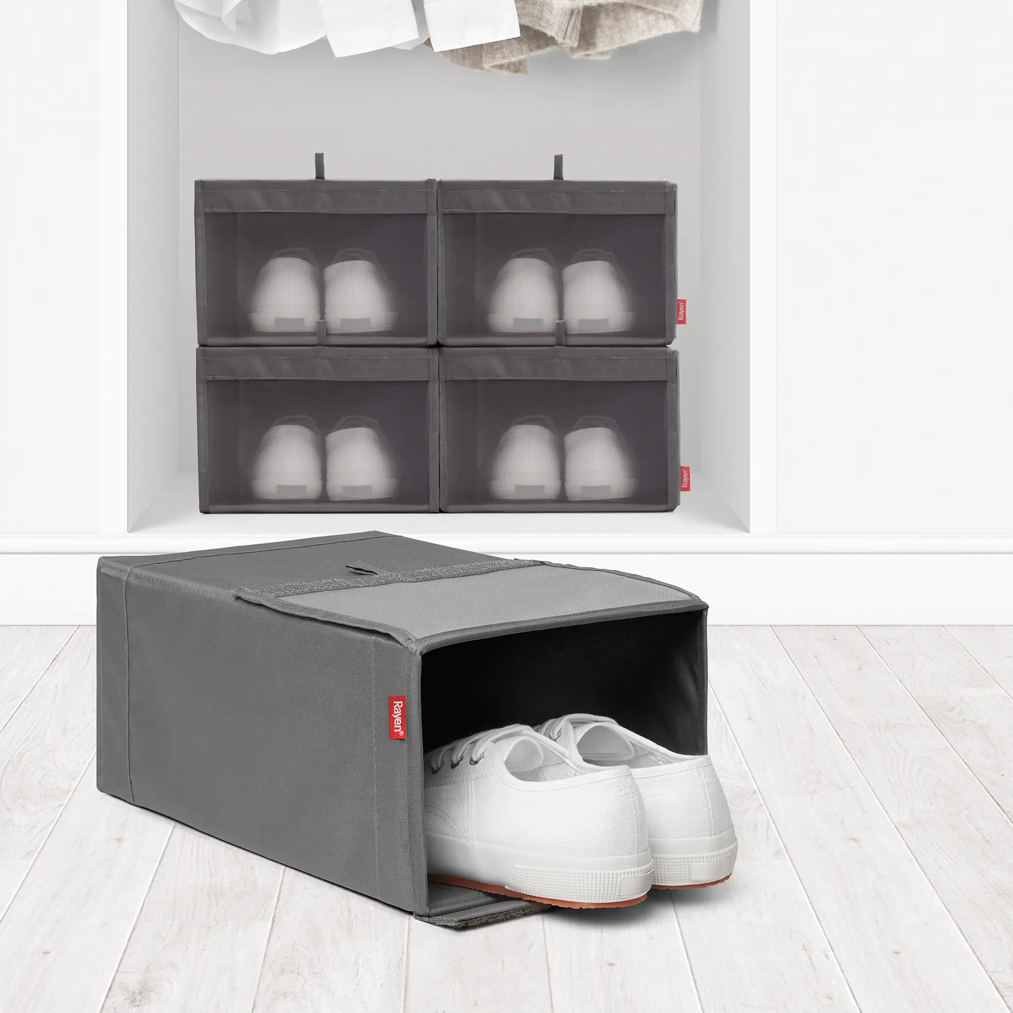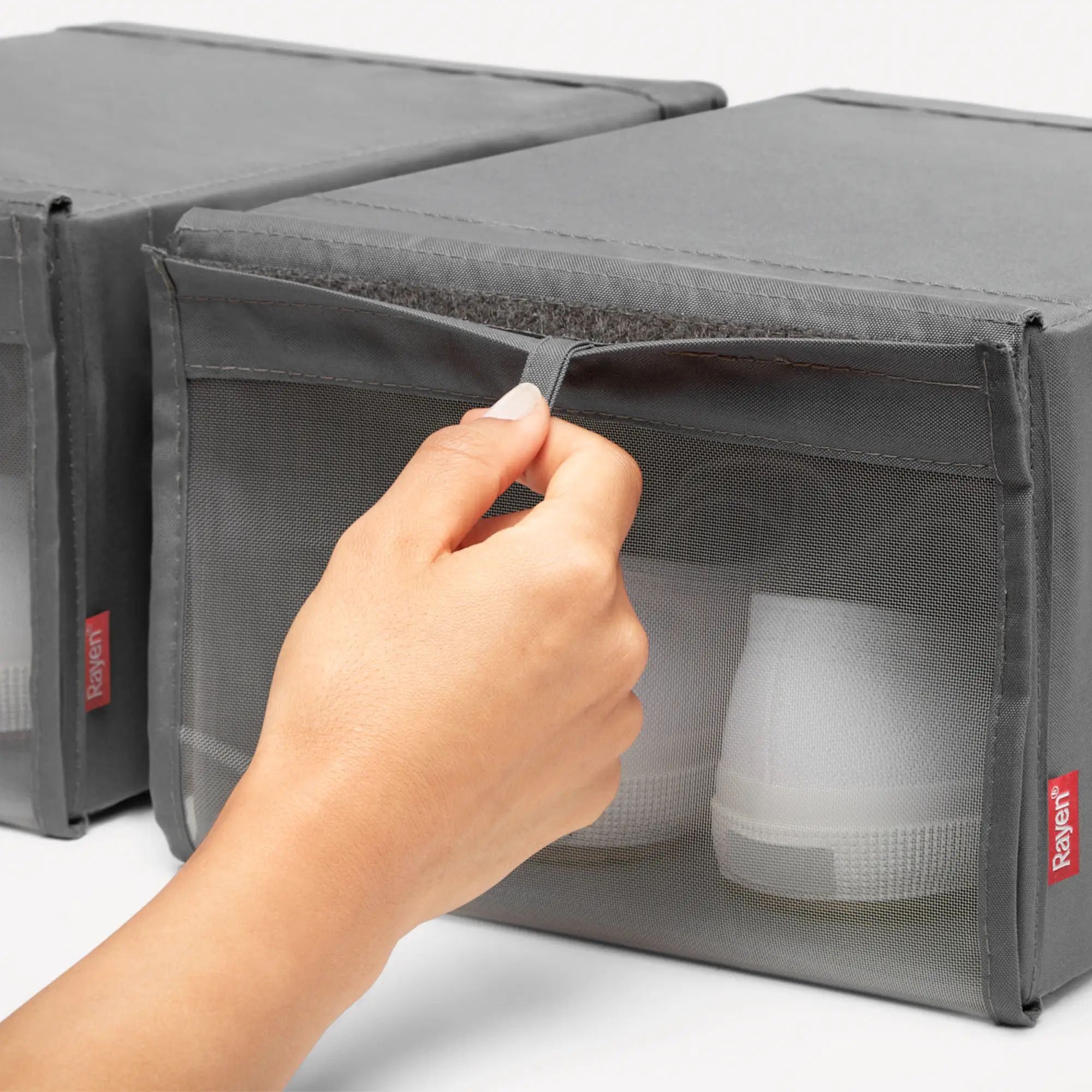 Dzięki praktycznemu okienku z siatki z łatwością zidentyfikujesz zawartość każdego pudełka, a solidny rzep zapewnia szybkie otwieranie i zamykanie. Dodatkowo, gdy pudełka nie są potrzebne, można je łatwo złożyć i schować, dzięki zamkowi umieszczonemu na ich tylnej stronie. Wybierz eleganckie i praktyczne rozwiązanie dla swojego obuwia z firmą Rayen.