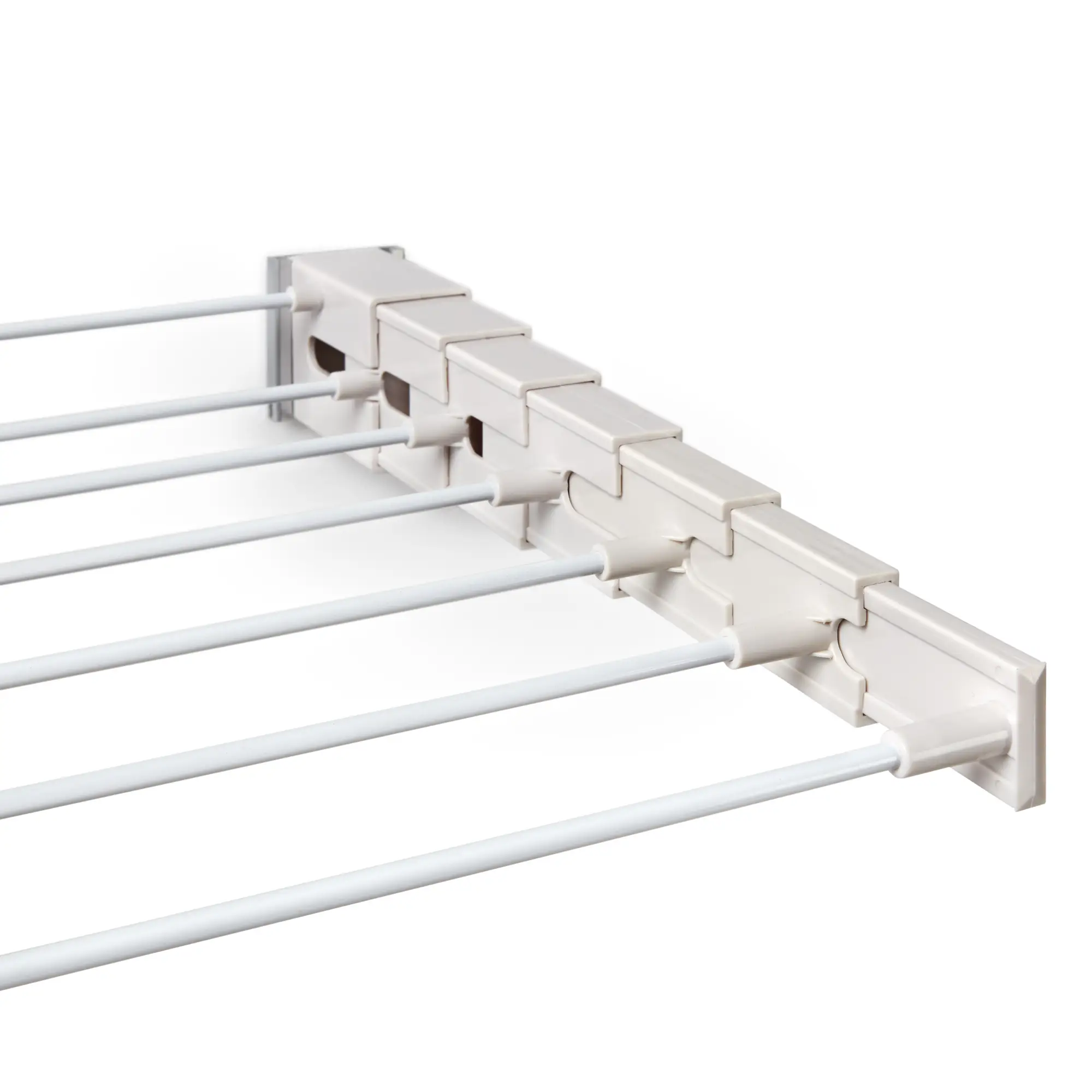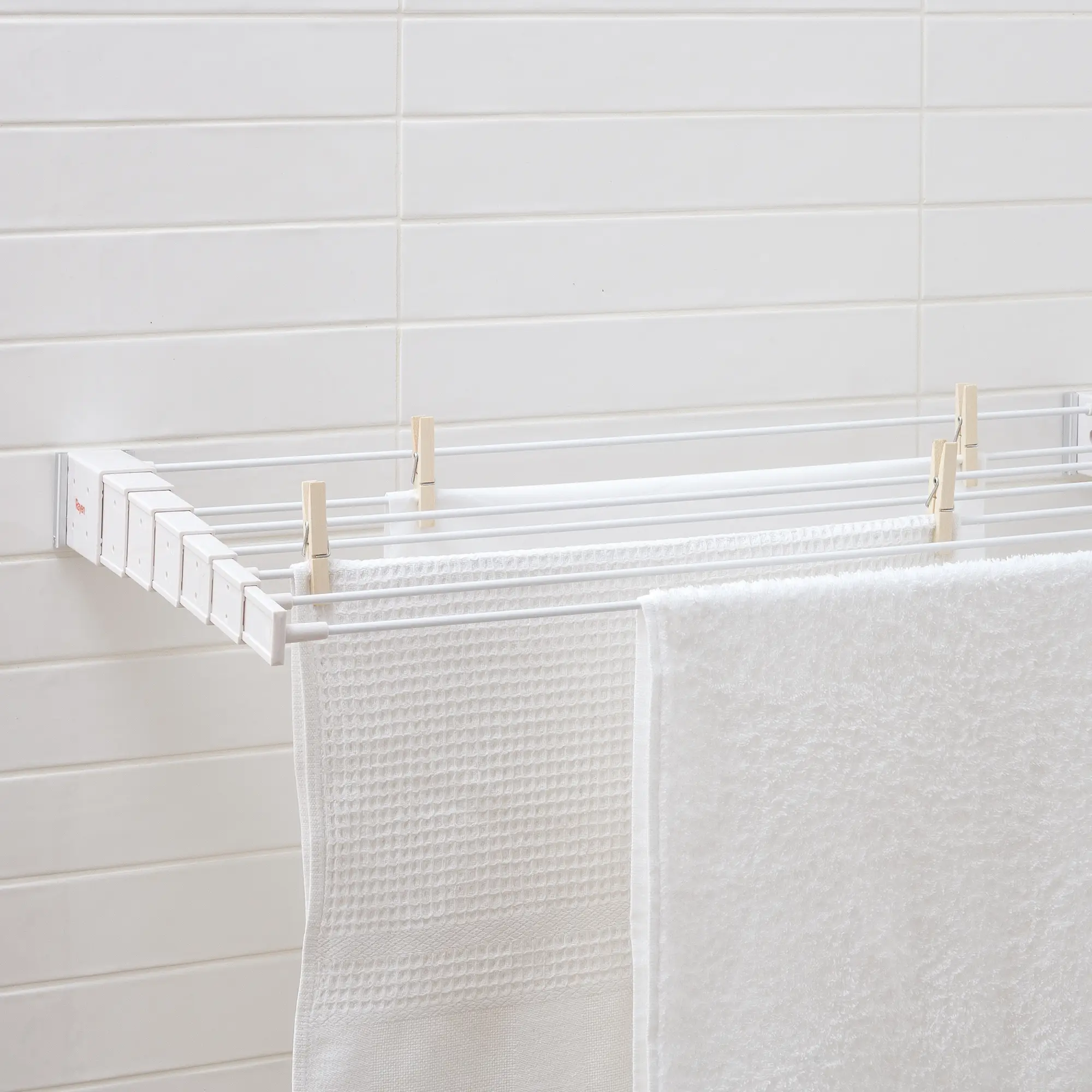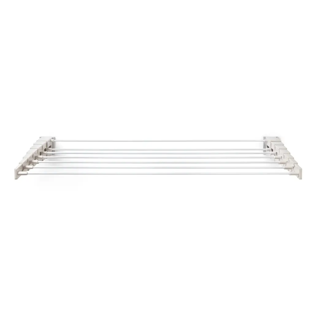 Teleskopowa suszarka zapewnia aż 5 metrów powierzchni do wieszania prania, jednocześnie zajmując minimalną ilość miejsca po złożeniu.