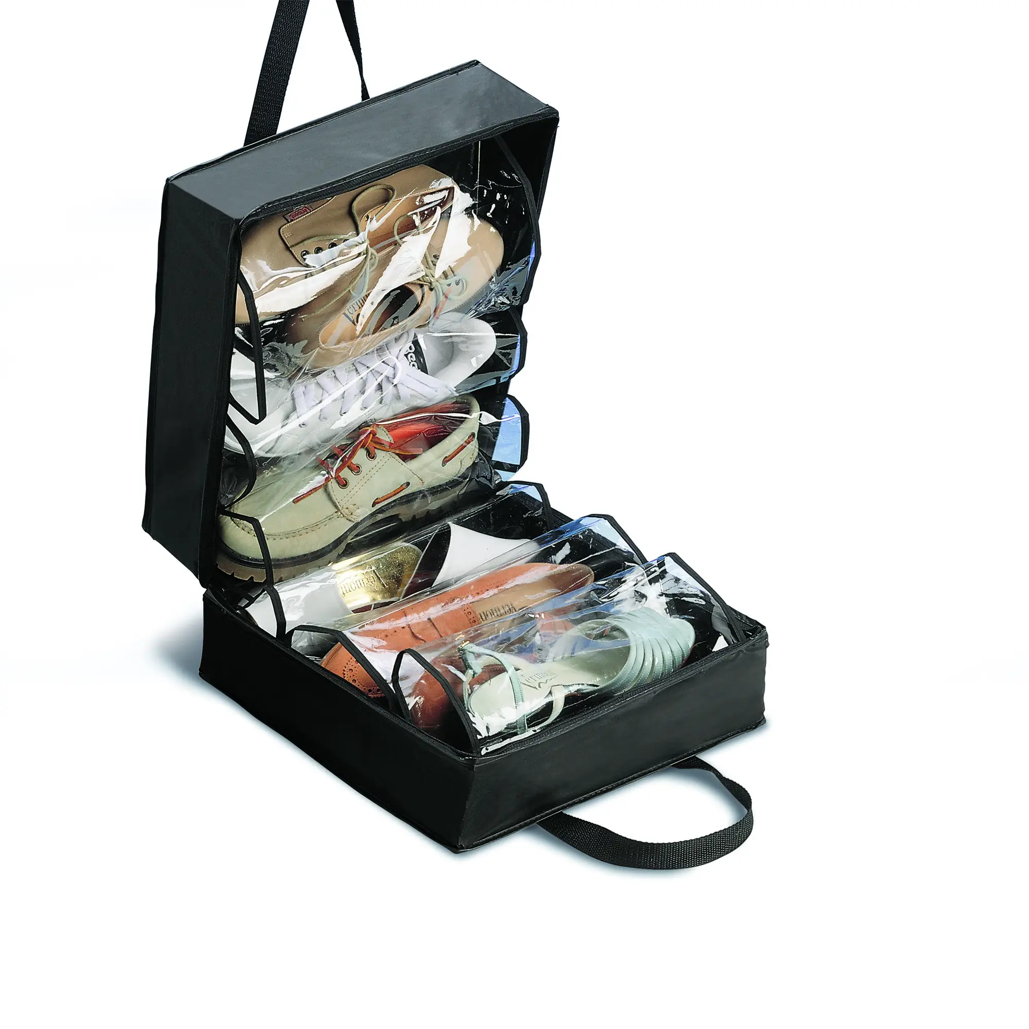 w jednym miejscu, gotowe do użycia. Dwa solidne uchwyty ułatwiają przenoszenie, a zamek błyskawiczny gwarantuje szybki dostęp do zawartości. Przeźroczyste kieszonki z tworzywa sztucznego nie tylko chronią obuwie przed przemieszczaniem się, ale też zabezpieczają torbę przed zabrudzeniem.