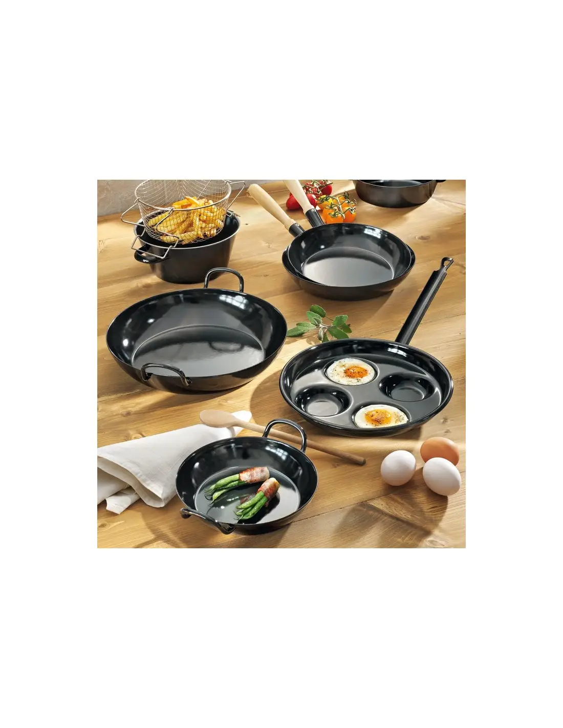 Patelnia marki Riess ma 4 otwory, dzięki którym przygotujesz idealne jajka sadzone lub małe naleśniki. Posiada długi, wygodny uchwyt. Nie zawiera w swoim składzie niklu. Jest idealna dla alergików. Można jej używać na każdym typie kuchenki. Powłoka patelni jest łatwa do czyszczenia i odporna na zarysowania i zadrapania.