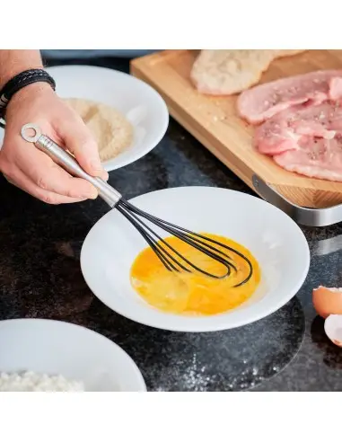 - Płaski kształt trzepaczki jest szczególnie odpowiedni do mieszania małych ilości w płaskich naczyniach