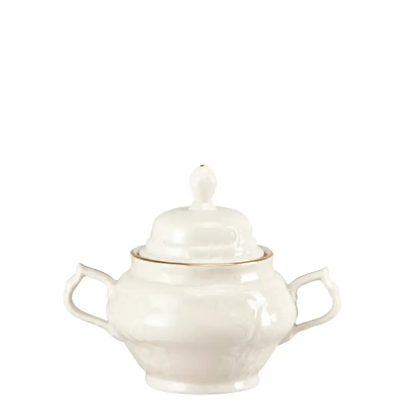 Cukiernica Sanssouci Gold Rosenthal to elegancki element zastawy, który łączy klasyczny styl z najwyższą jakością wykonania. Wzór Sanssouci Gold to hołd dla wyrafinowanej tradycji porcelany, inspirowany XVIII-wiecznym stylem rokoko, co stanowi tę cukiernicę dzieł sztuki użytkowej.