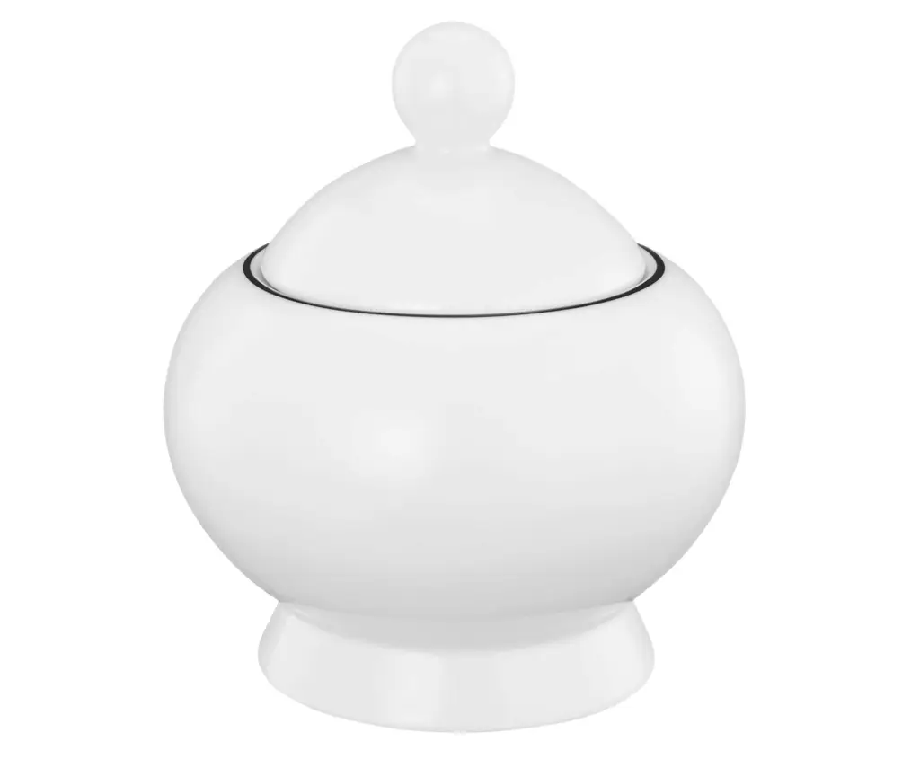Porcelanowa cukiernica o pojemności 250ml, to elegancki i praktyczny dodatek do każdej zastawy stołowej. Jej klasyczna biała barwa, ozdobiona subtelnym akcentem czarnej obwódki, nadaje jej prostoty i elegancji, doskonale komponując się z pozostałymi elementami zastawy.