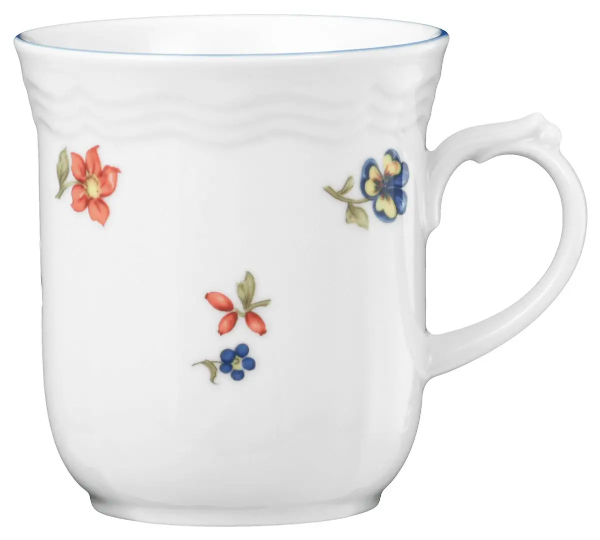 Śnieżnobiała porcelana została ozdobiona motywem polnych kwiatów, które przywodzą na myśl sielskie krajobrazy. Delikatna niebieska obwódka oraz falowane brzegi nadają mu rustykalnego wydźwięku. Solidność wykonania sprawia, że kubek idealnie sprawdzi się w codziennym użytkowaniu przez wiele lat.