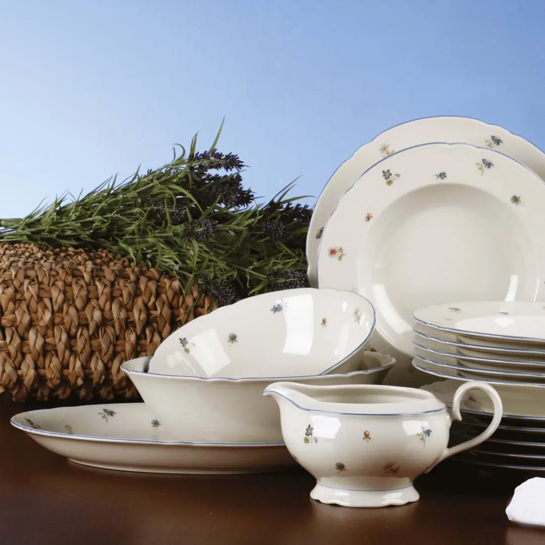 Elegancka i praktyczna miska o średnicy 23cm, to idealny wybór do serwowania drobnych przekąsek, deserów czy sałatek. Wykonana z wysokiej jakości porcelany w klasycznym beżu, ozdobiona jest subtelnym wzorem małych kwiatków oraz delikatną niebieską obwódką, która nadaje jej romantycznego charakteru.
