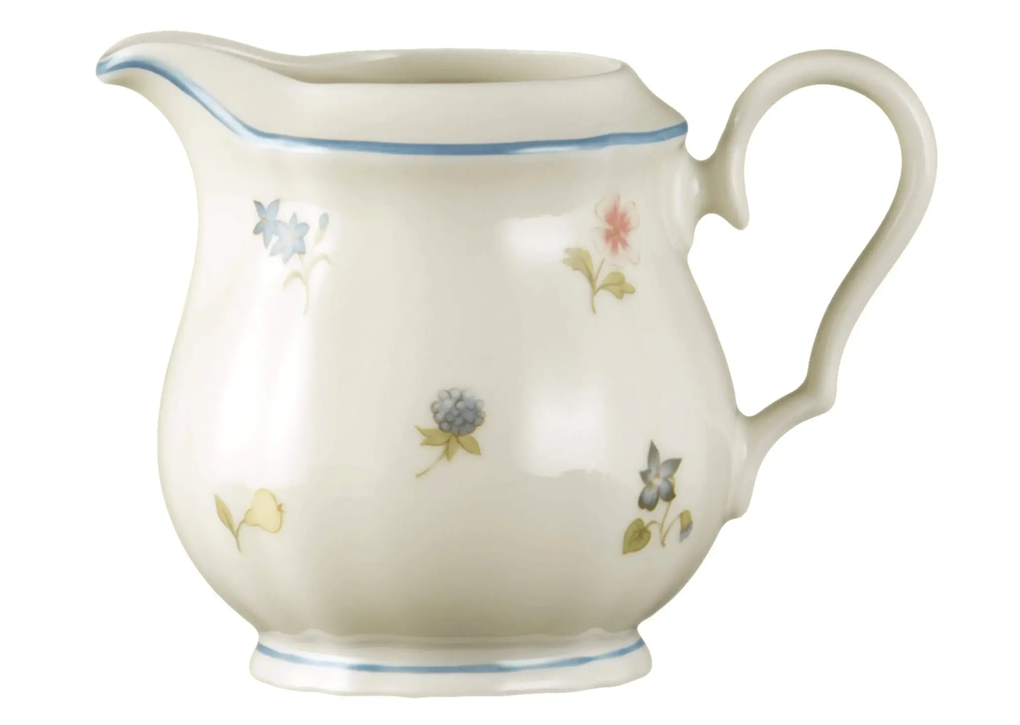 Mlecznik o pojemności 180ml, to elegancki i subtelny dodatek do zastawy stołowej, idealnie komponujący się z filiżankami, talerzykami i innymi elementami kolekcji. Wykonany z wysokiej jakości porcelany w klasycznym beżu, ozdobiony jest delikatnym wzorem małych kwiatów oraz subtelną niebieską obwódką, która nadaje mu romantycznego charakteru.