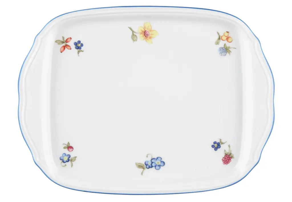 Prostokątny półmisek o wymiarach 20.5x12.5cm, to elegancki i funkcjonalny element zastawy stołowej, idealny do serwowania pieczeni, grillowanych ryb, przekąsek czy dań głównych. Wykonany z wysokiej jakości porcelany w klasycznej bieli, ozdobiony jest delikatnym wzorem małych kwiatów oraz subtelną niebieską obwódką, która nadaje mu romantycznego charakteru.