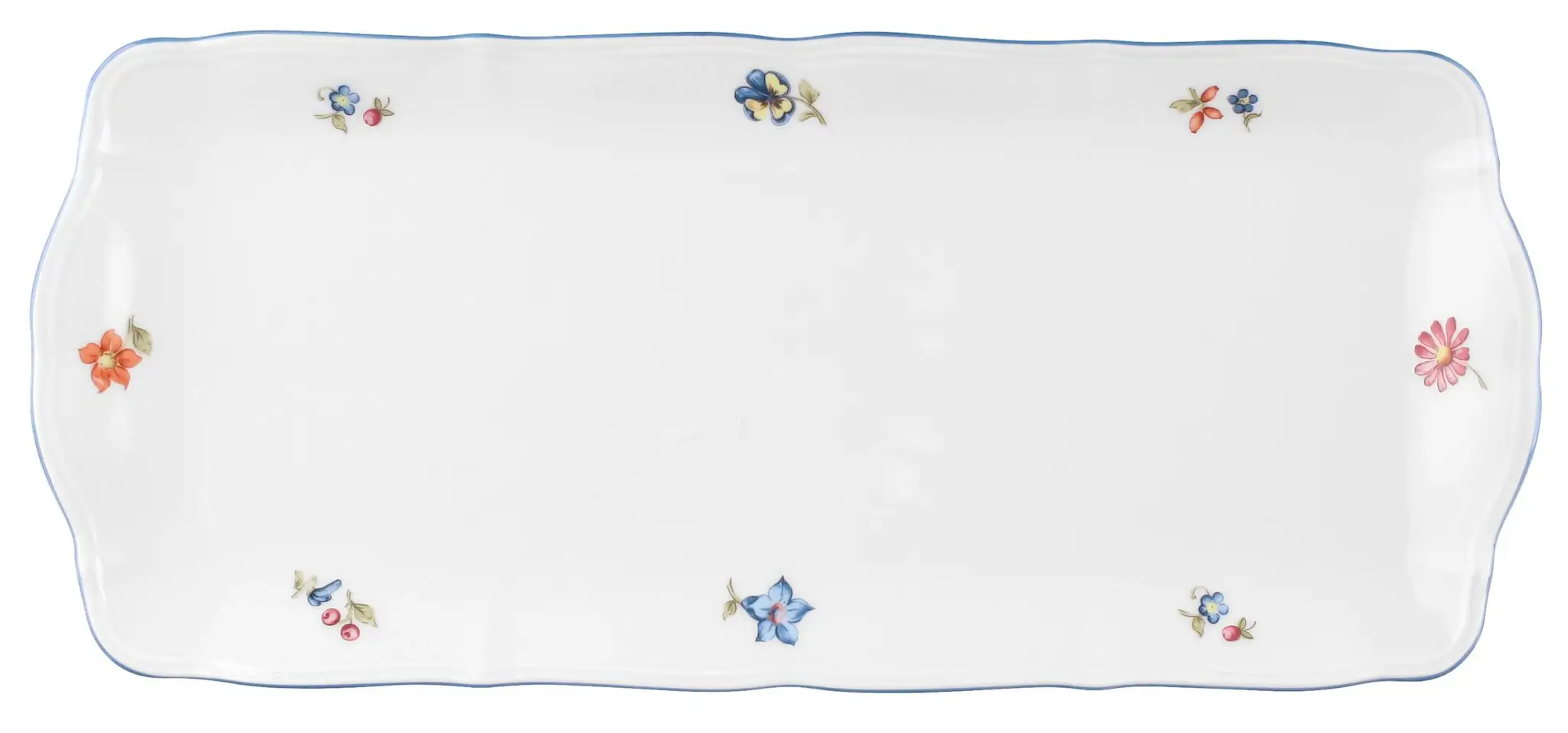 Prostokątny półmisek o wymiarach 35x17.5cm, to elegancki i funkcjonalny element zastawy stołowej, idealny do serwowania pieczeni, grillowanych ryb, przekąsek czy dań głównych. Wykonany z wysokiej jakości porcelany w klasycznej bieli, ozdobiony jest delikatnym wzorem małych kwiatów oraz subtelną niebieską obwódką, która nadaje mu romantycznego charakteru.