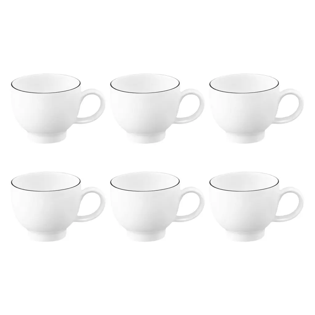 Filiżanki wyróżniają się minimalistycznym wzornictwem, a subtelna czarna obramówka dodaje im wyrafinowanego charakteru. Wykonane z wysokiej jakości porcelany, są trwałe, odporne na zarysowania i łatwe w utrzymaniu w czystości.