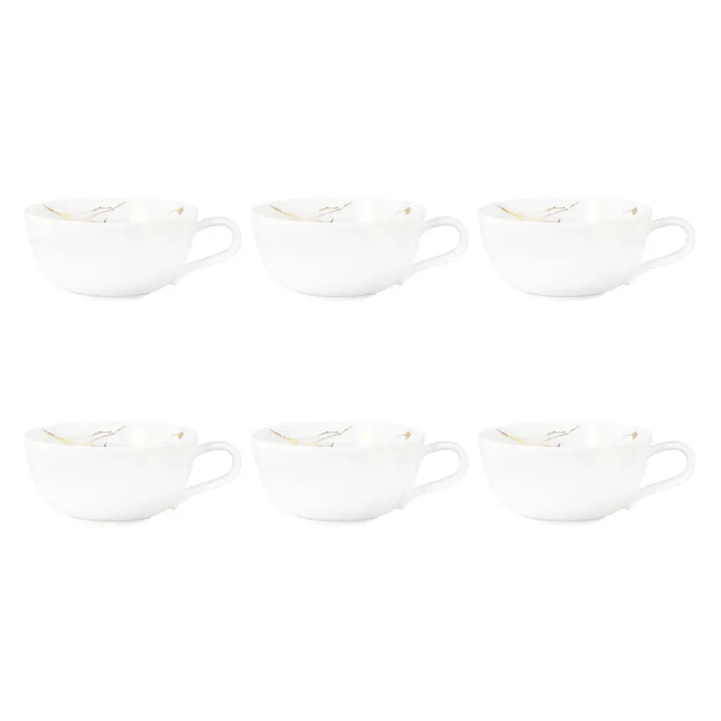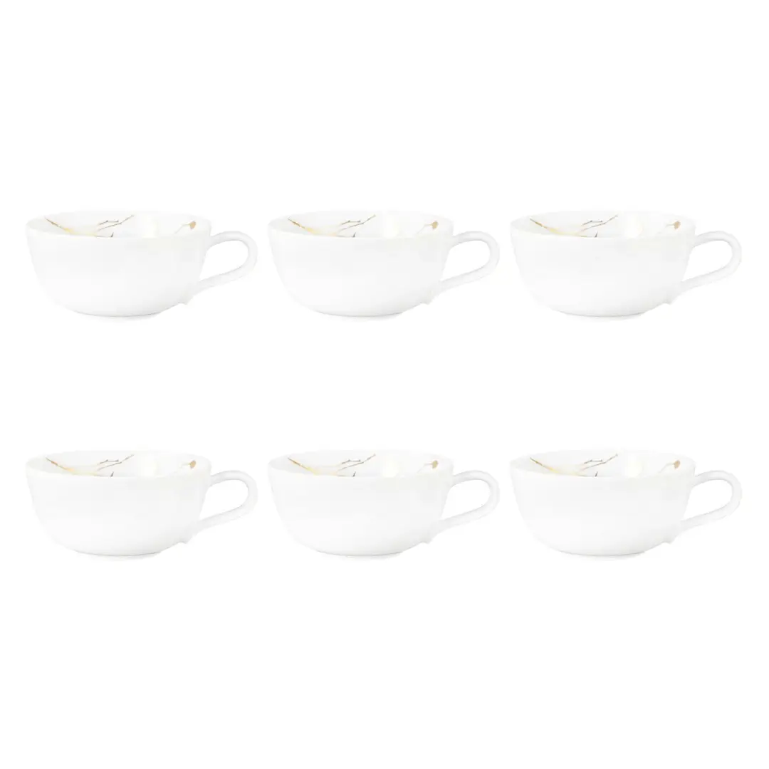 Zestaw filiżanek o pojemności 280ml, to połączenie klasycznej elegancji i subtelnej inspiracji naturą. Biała porcelana stanowi doskonałe tło dla delikatnego złotego wzoru listków, który dodaje filiżankom wyrafinowanego i stylowego charakteru.