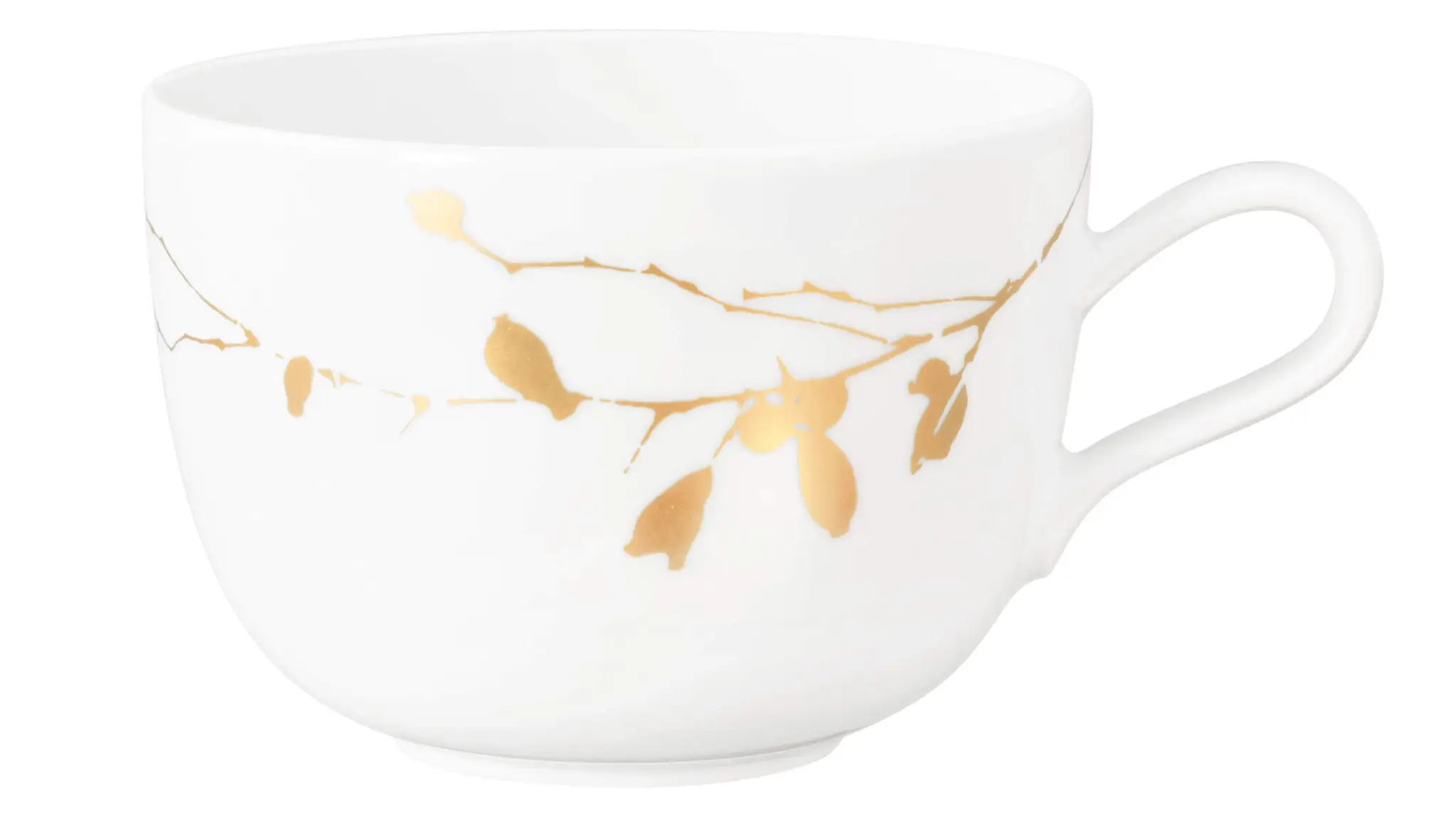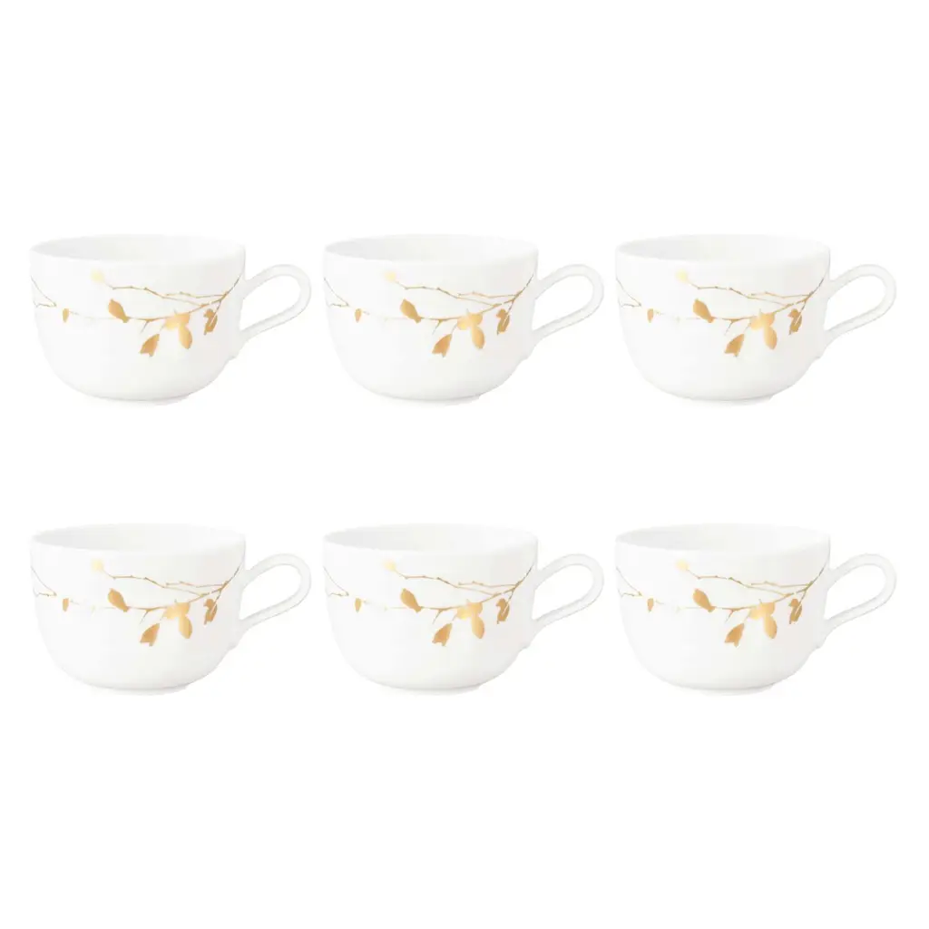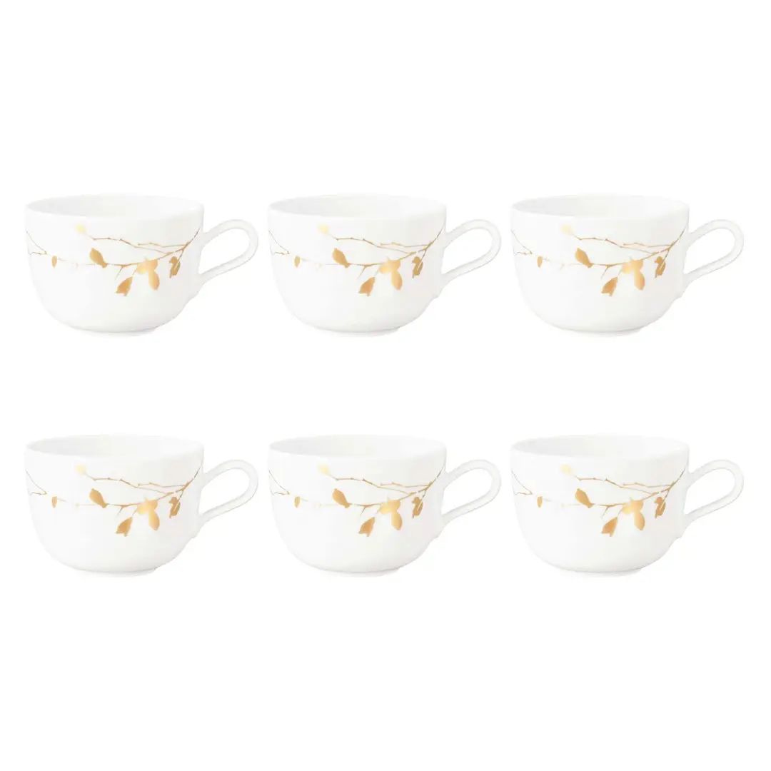 Zestaw filiżanek o pojemności 380ml, to połączenie klasycznej elegancji i subtelnej inspiracji naturą. Biała porcelana stanowi doskonałe tło dla delikatnego złotego wzoru listków, który dodaje filiżankom wyrafinowanego i stylowego charakteru.