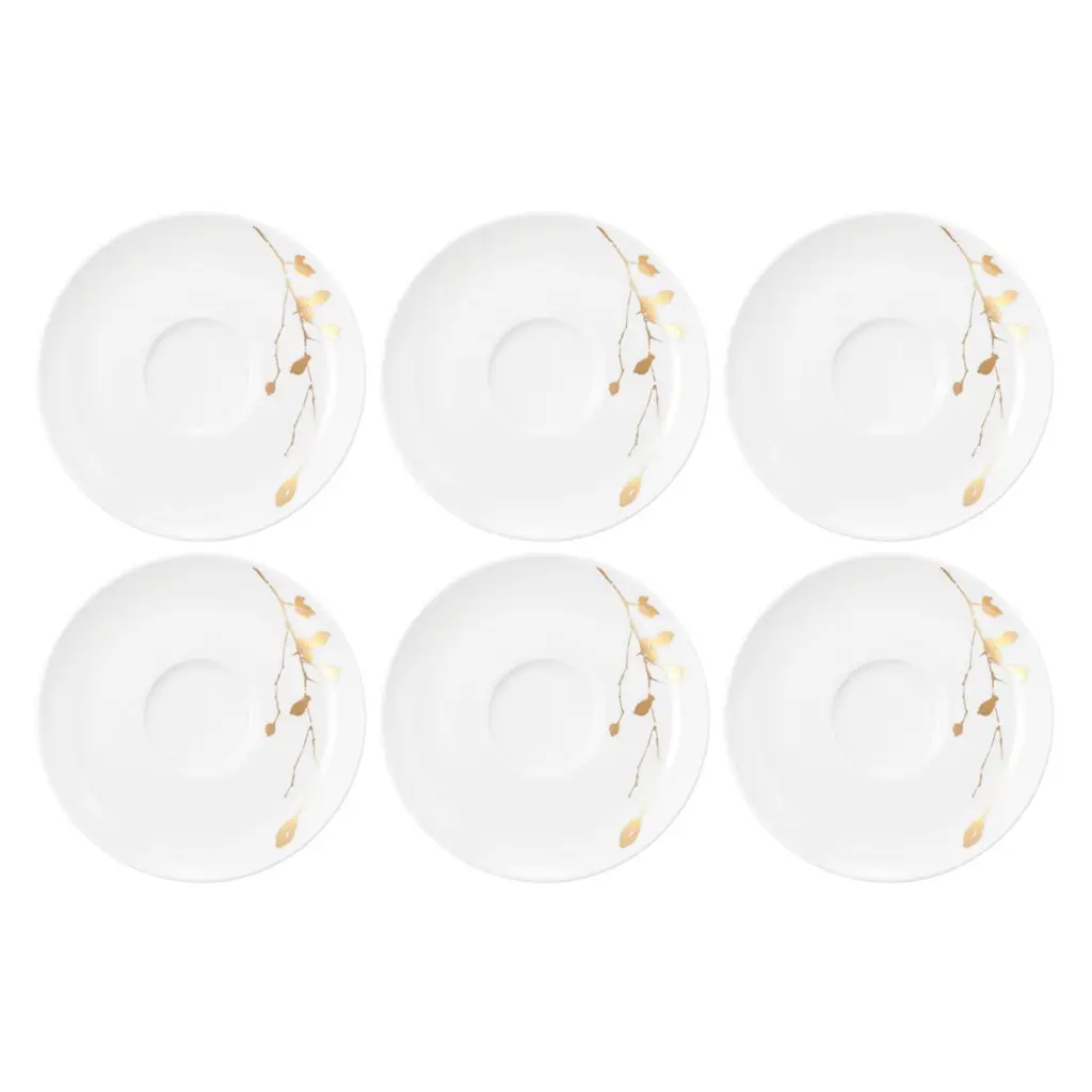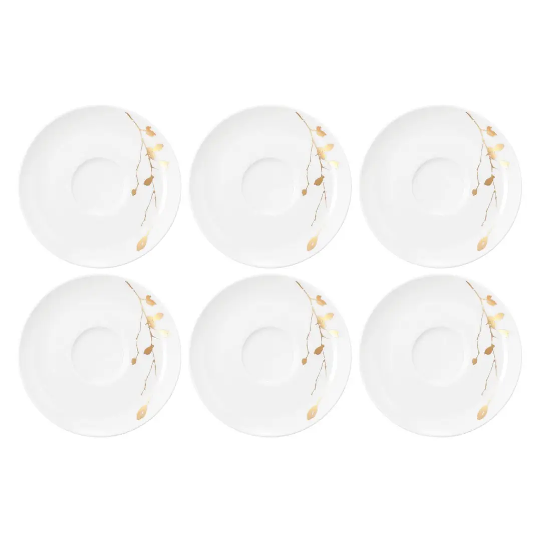 Zestaw spodków do filiżanek o średnicy 16.5cm, to eleganckie i stylowe dodatki, które wprowadzają subtelną harmonię natury na Twój stół. Biała porcelana stanowi doskonałą bazę dla delikatnego złotego wzoru listków, który nadaje całości wyrafinowanego charakteru.