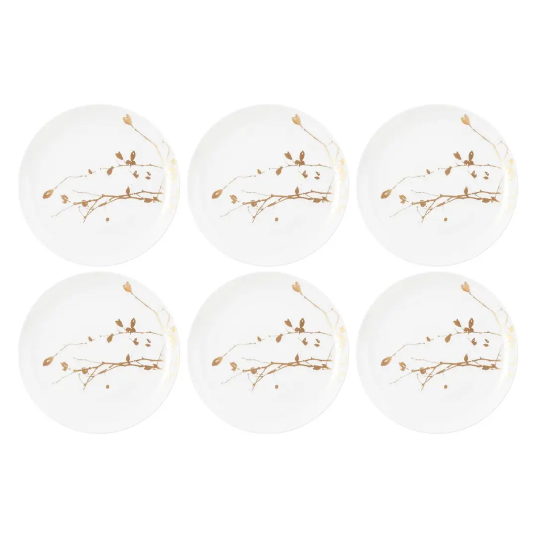 Zestaw talerzy do sałatek o średnicy 22.5cm, to eleganckie i stylowe naczynia, które wnoszą na stół subtelne piękno inspirowane naturą. Biała porcelana stanowi doskonałe tło dla delikatnego złotego wzoru listków, dodając całości wyrafinowanego i luksusowego charakteru.