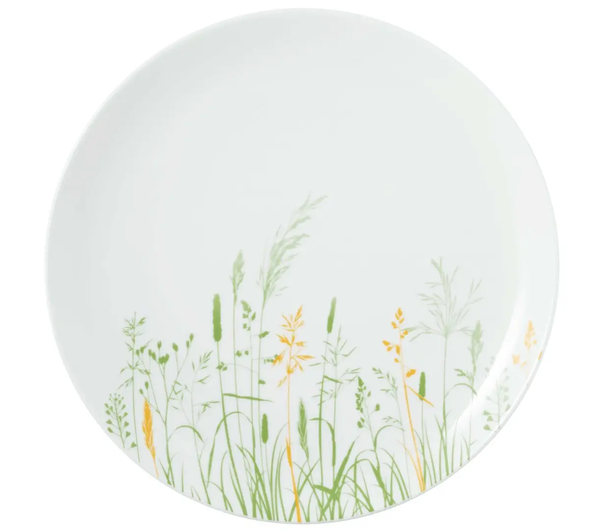 Talerz obiadowy o średnicy 27.5cm, to harmonijne połączenie klasycznej elegancji z naturalnym, letnim urokiem. Biała porcelana stanowi subtelne tło dla delikatnego wzoru zielono-żółtych polnych kwiatów i traw, który przywodzi na myśl sielską łąkę skąpaną w promieniach słońca.