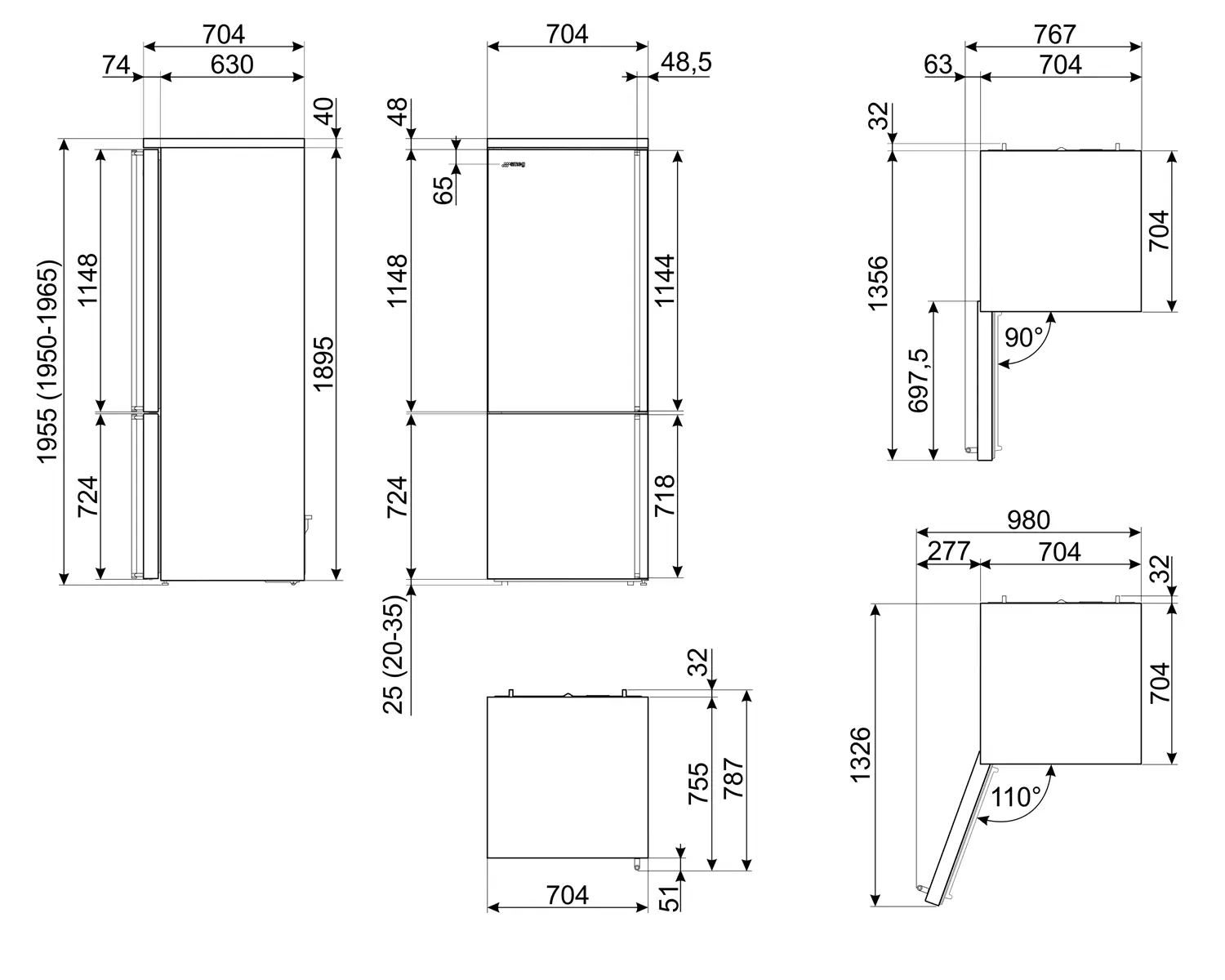 - Głębokość przy otwartych drzwiach pod kątem 90°: 1356 mm