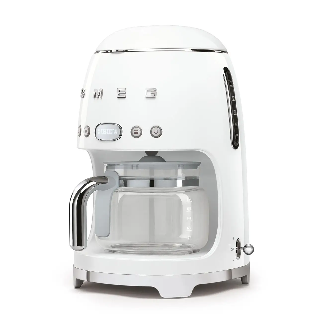 Ekspres do kawy SMEG został zaprojektowany z myślą o użytkownikach w ciągłym biegu, którzy jednak cenią sobie chwilę przyjemności z ulubionym napojem. Urządzenie obejmuje wyjmowany pojemnik na wodę (mieszczący ponad litr płynu) oraz filtr do kawy wielokrotnego użytku. Do Twojej dyspozycji pozostaje kilka funkcjonalnych przycisków, takich jak funkcja utrzymania temperatury czy napełnianie kilku filiżanek. Panel sterowania jest bardzo intuicyjny i nie nastręcza zbędnych trudności w obsłudze. Innowacyjny system grzewczy, uchwyt na filtr, możliwość regulacji temperatury i twardości wody, wskaźnik obwieszczający konieczność odkamienienia – wszystko to sprawia, że możesz być spokojny o bezpieczeństwo swoje i swojego ekspresu.