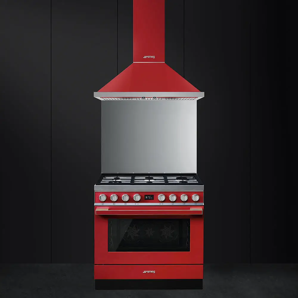 Kuchnia wolnostojąca CPF9GPR z czyszczeniem pirolitycznym w kolorze czerwonym z linii Portofino od firmy Smeg to płyta gazowa, do tradycyjnego gotowania oraz piekarnik elektryczny klasy A+ dla większej wygody pieczenia potraw.
