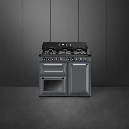 Kuchnia wolnostojąca TR103GR z czyszczeniem parowym w kolorze niebieskoszarym z linii Victoria od firmy Smeg to płyta gazowa (6 palników) oraz piekarniki elektryczne klasy A oraz B dla większej wygody pieczenia potraw.