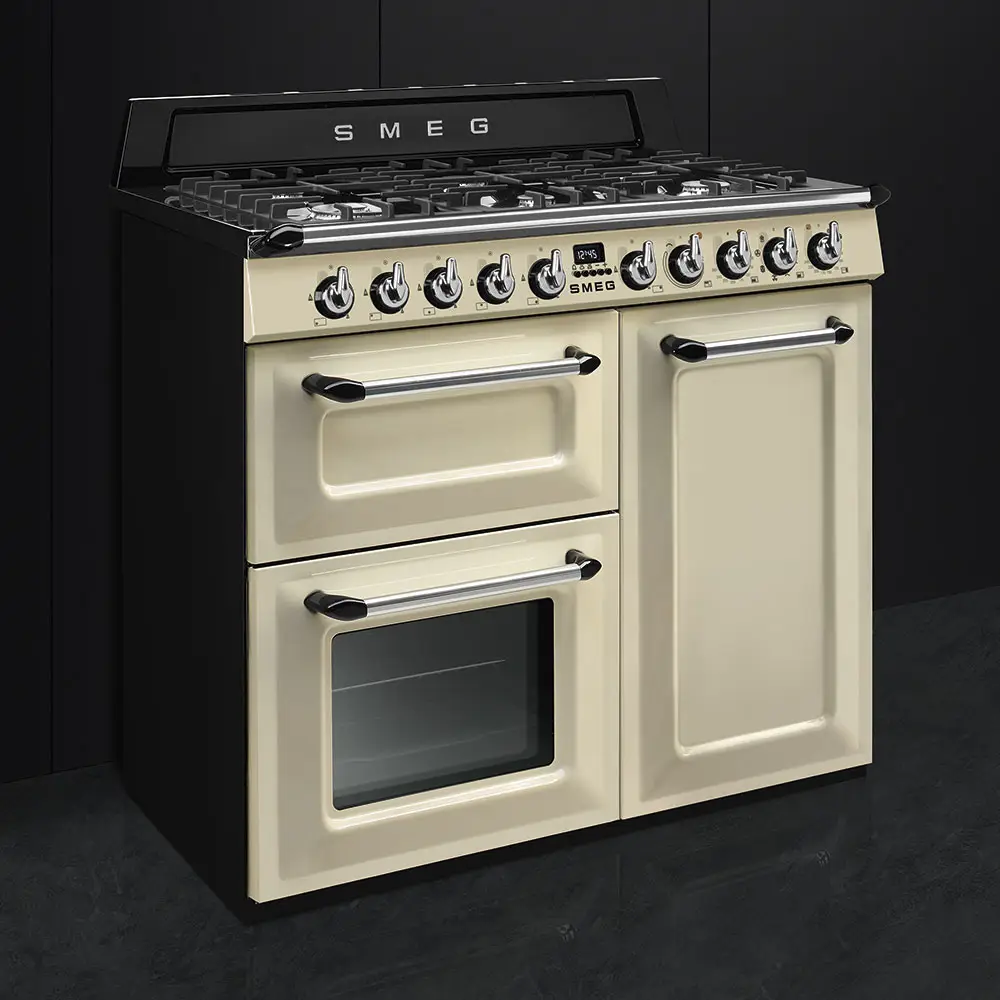Kuchnia wolnostojąca TR103P z czyszczeniem parowym w kolorze kremowym z linii Victoria od firmy Smeg to płyta gazowa (6 palników) oraz piekarniki elektryczne klasy A oraz B dla większej wygody pieczenia potraw.