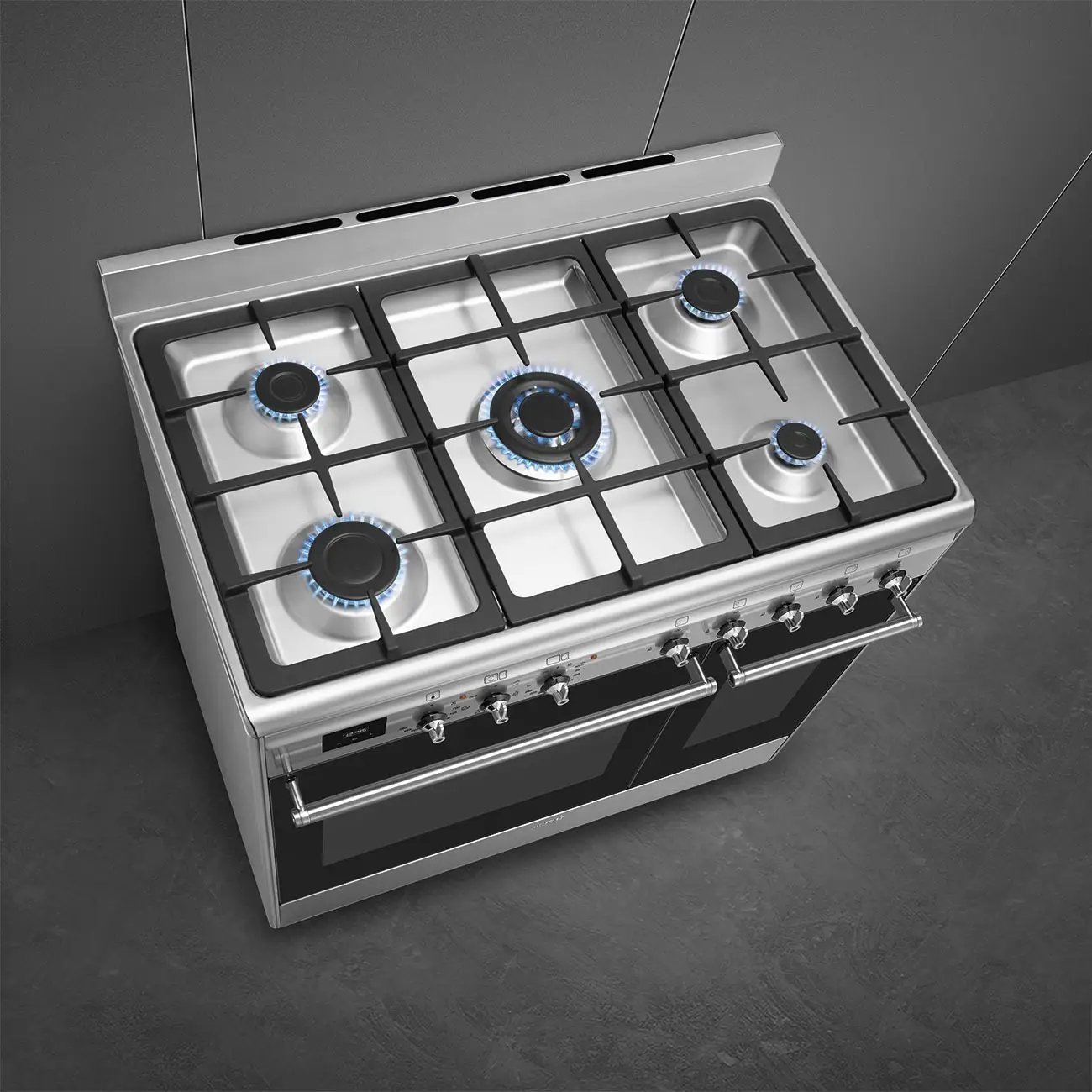 Smeg CX92GM to zaawansowana kuchnia wolnostojąca o szerokości 90 cm z kolekcji Classica (seria Concerto), stworzona dla wymagających użytkowników. Połączenie dwukomorowego piekarnika z płytą gazową daje szerokie możliwości kulinarne i pozwala gotować na wielu poziomach równocześnie. Obudowa ze stali nierdzewnej i dopracowane detale – takie jak pokrętła Classica i tłoczone logo – podkreślają elegancki, profesjonalny wygląd urządzenia.