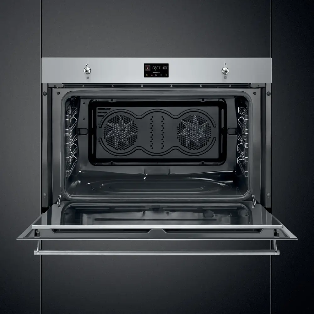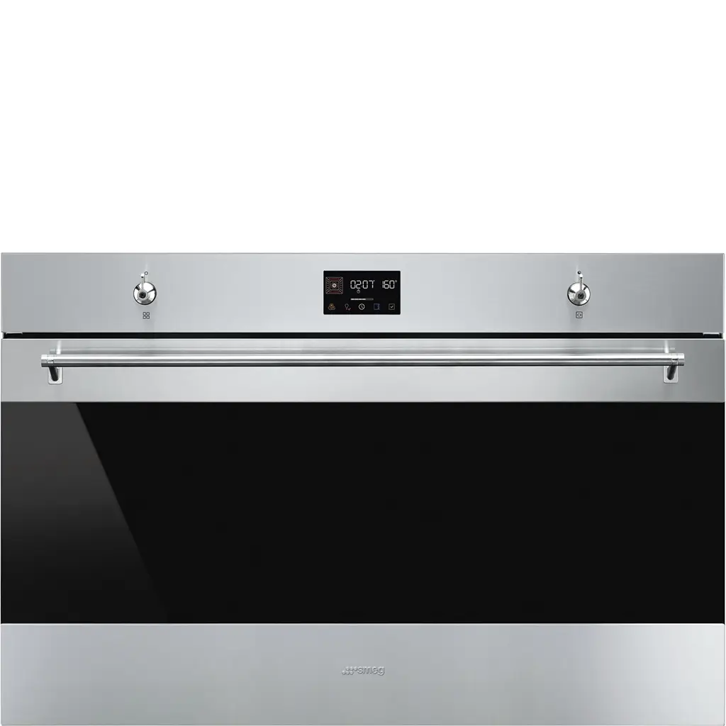 SMEG SF9302TX to nowoczesny piekarnik do zabudowy o szerokości 90 cm, należący do eleganckiej linii Classica. Urządzenie łączy dużą pojemność, zaawansowane funkcje pieczenia oraz automatyczny system czyszczenia pyrolitycznego, zapewniając wygodę i perfekcyjne rezultaty podczas codziennego gotowania.
