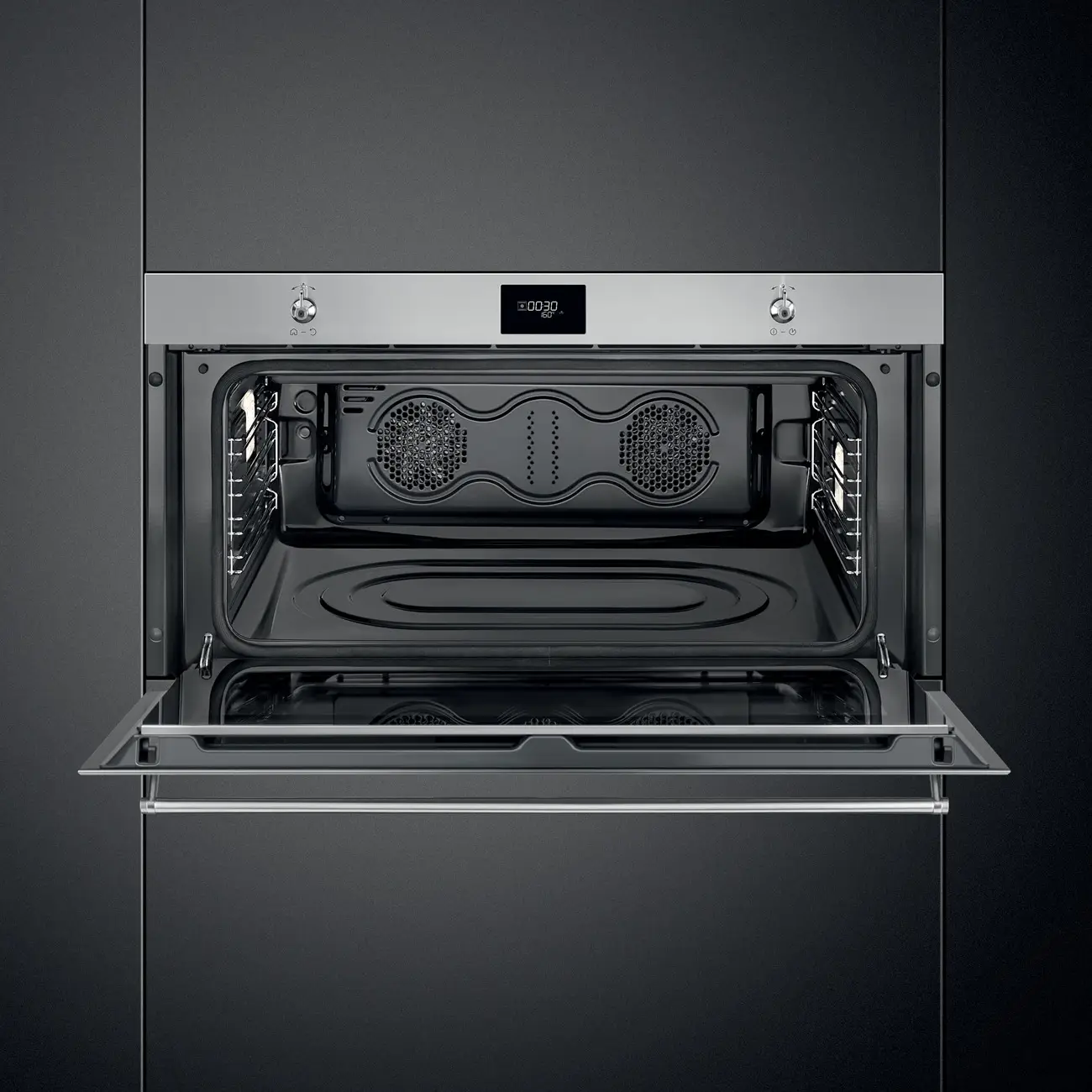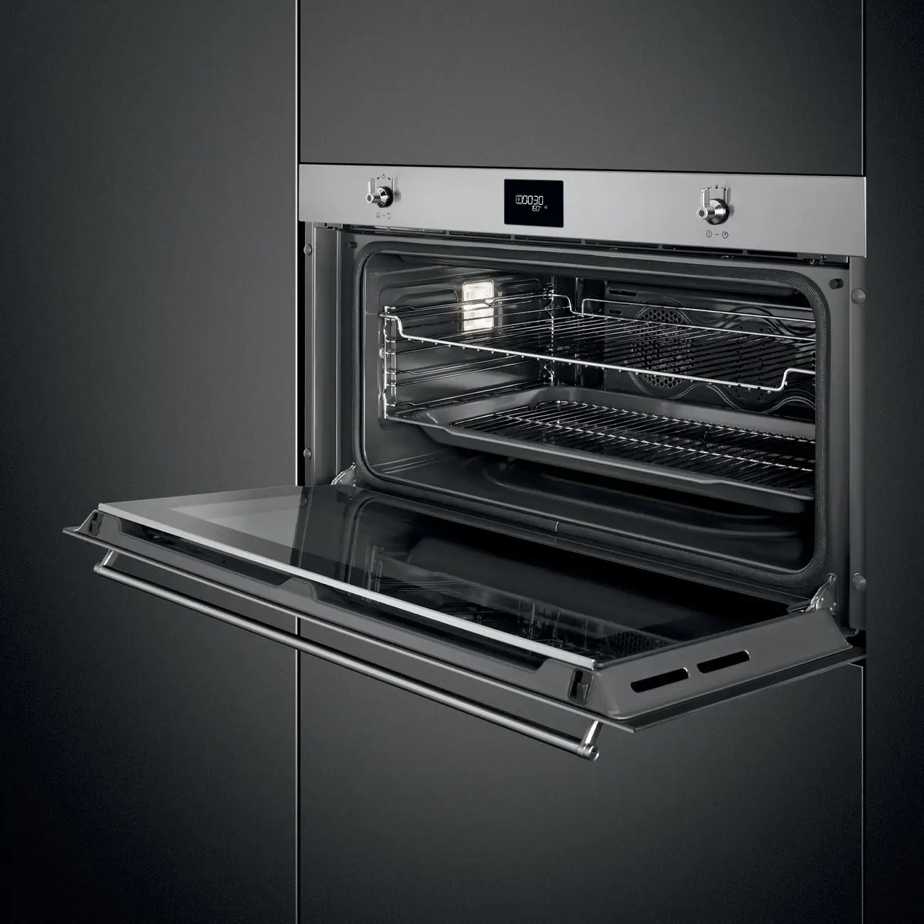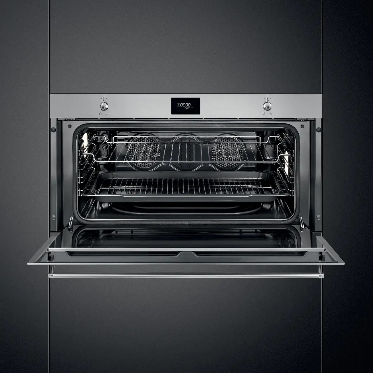 SMEG SFPR9301TX to kompaktowy piekarnik o szerokości 90 cm z serii Classica, który łączy elegancki design ze stali nierdzewnej z zaawansowaną technologią pieczenia. Urządzenie wykorzystuje termoobieg z dwoma wentylatorami, zapewniając równomierne rozprowadzanie ciepła i doskonałe rezultaty pieczenia.