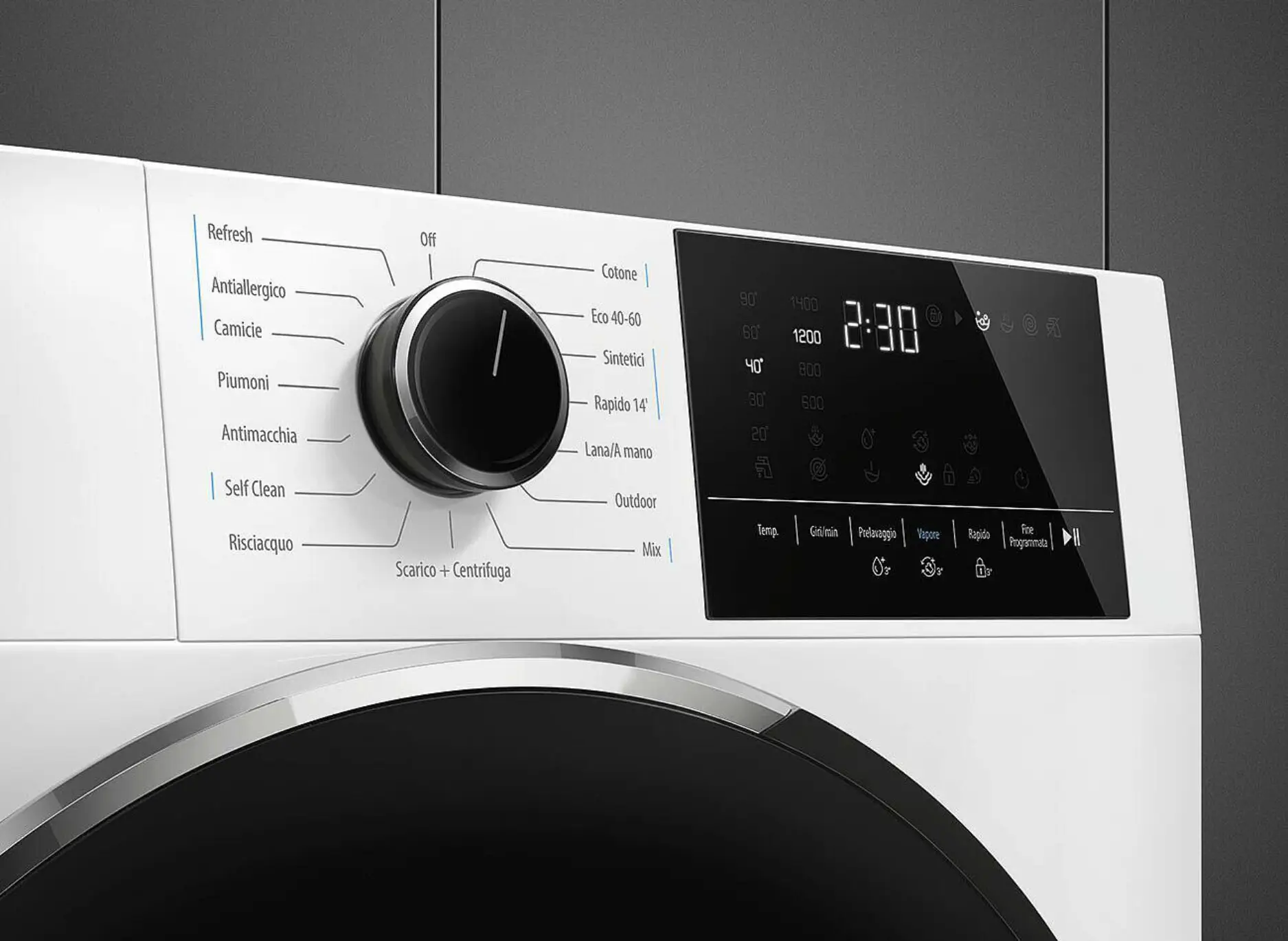 Wyświetlacz pralki pokazuje czas trwania programu, opóźnienie startu oraz status cyklu. Przyciski i opcje na panelu pozwalają dostosować pranie do indywidualnych preferencji, takie jak prędkość wirowania, temperatura, pranie wstępne czy program parowy.