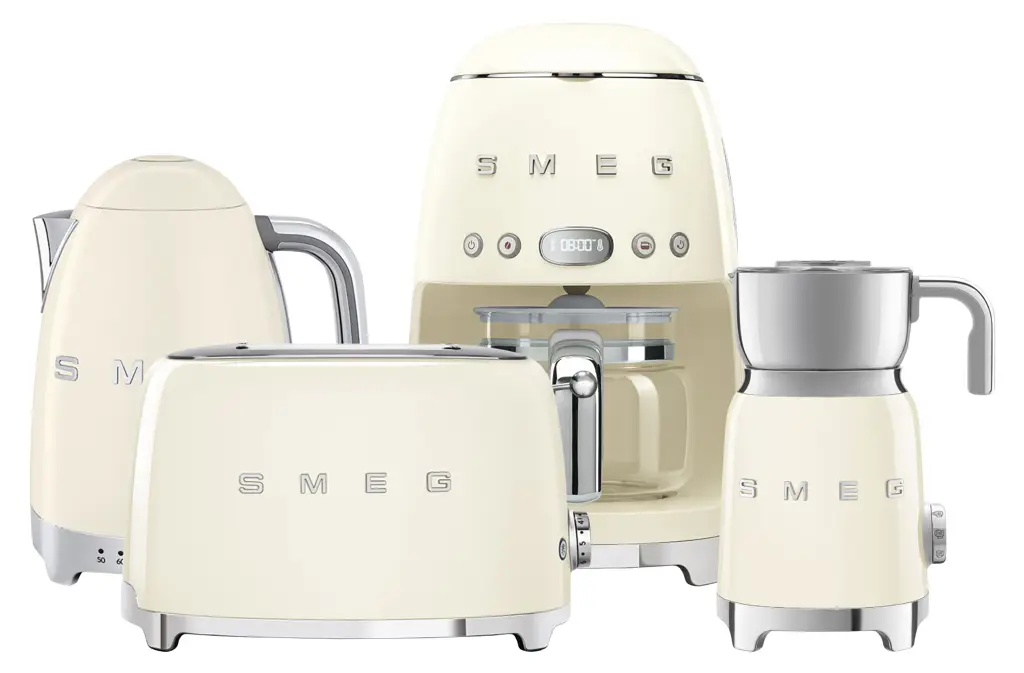 Zestawy produktów z ekspresami z linii 50’s Retro Style marki Smeg ułatwią i przyśpieszą przygotowywanie kawy lub śniadań - dołączony toster pozwoli zrobić grzanki, czajnik z regulacją temperatury umożliwi zagotowanie wody na herbatę, a spieniacz przyda się do uzyskiwania spienionego mleka. Konstrukcje urządzeń wykonane zostały z wysokiej jakości materiałów - m.in. tworzywa i stali nierdzewnej - i mają przemyślany design o opływowych kształtach i chromowanych podstawach, który w połączeniu z kolorowymi wykończeniami sprawia, że elegancko prezentują się one na blacie kuchennym - można je przechowywać na widoku, gdy akurat nie będą używane.