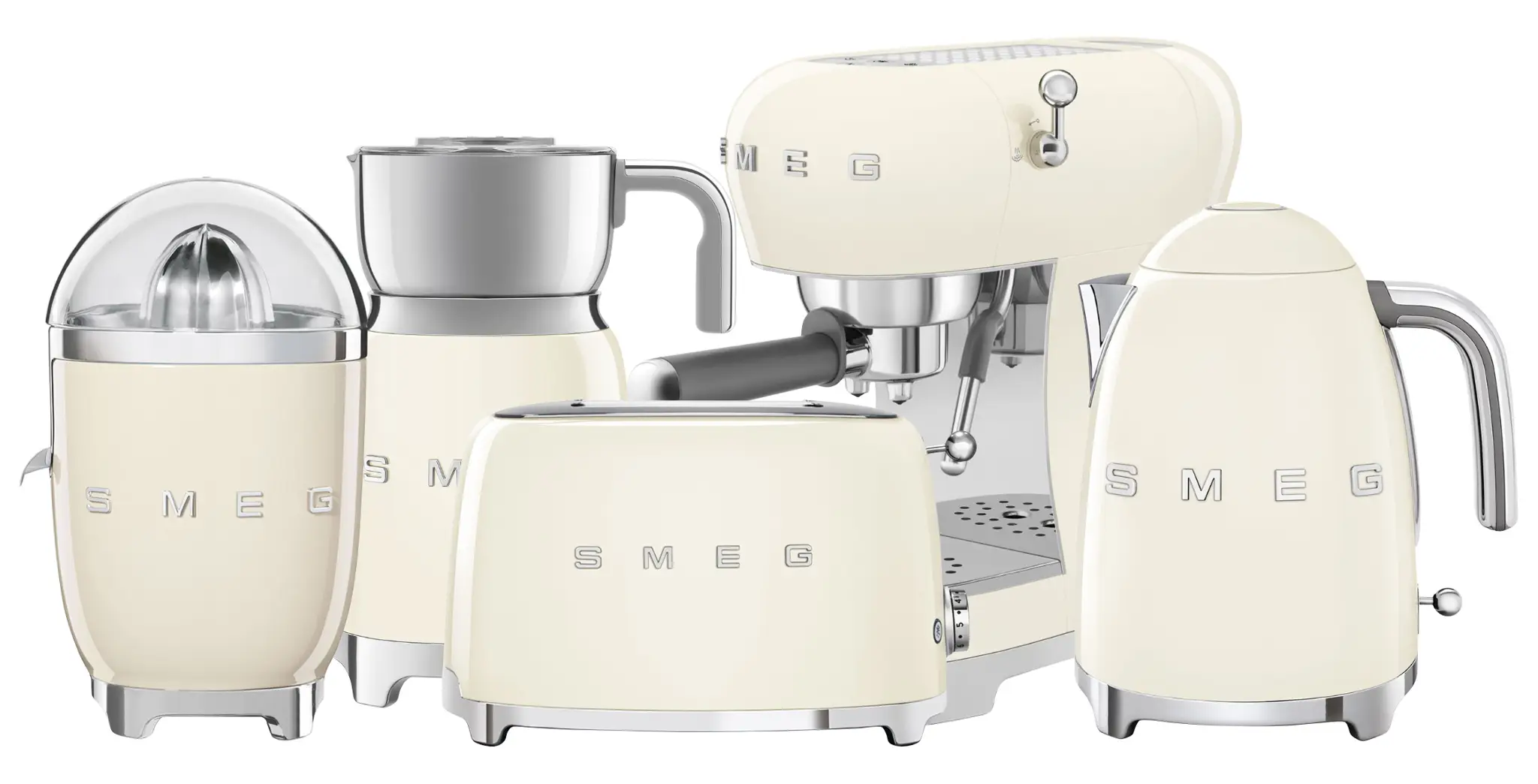 Oferowany zestaw produktów z linii 50’s Retro Style marki Smeg ułatwi przygotowanie codziennego śniadania z dodatkiem świeżego soku, spienionego mleka lub kawy. Wykonane z wysokiej jakości materiałów, m.in. tworzywa i stali nierdzewnej, urządzenia dzięki opływowym kształtom, chromowanym podstawom i delikatnemu kremowemu kolorowi wspaniale zaprezentują się na blacie kuchennym - można je więc będzie przechowywać na widoku, gdy akurat nie będą używane.