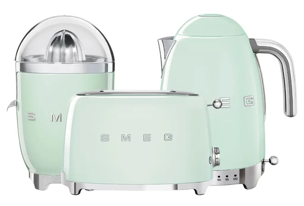 Oferowany zestaw śniadaniowy produktów z linii 50’s Retro Style marki Smeg ułatwi i przyśpieszy przygotowywanie codziennych posiłków z dodatkiem świeżo wyciskanego soku. Wykonane z wysokiej jakości materiałów - m.in. tworzywa i stali nierdzewnej - urządzenia mają przemyślany design o opływowych kształtach i chromowanych podstawach, który w połączeniu z pastelowym zielonym kolorem sprawia, że świetnie zaprezentują się one na blacie kuchennym - można je będzie przechowywać na widoku, gdy akurat nie będą używane.