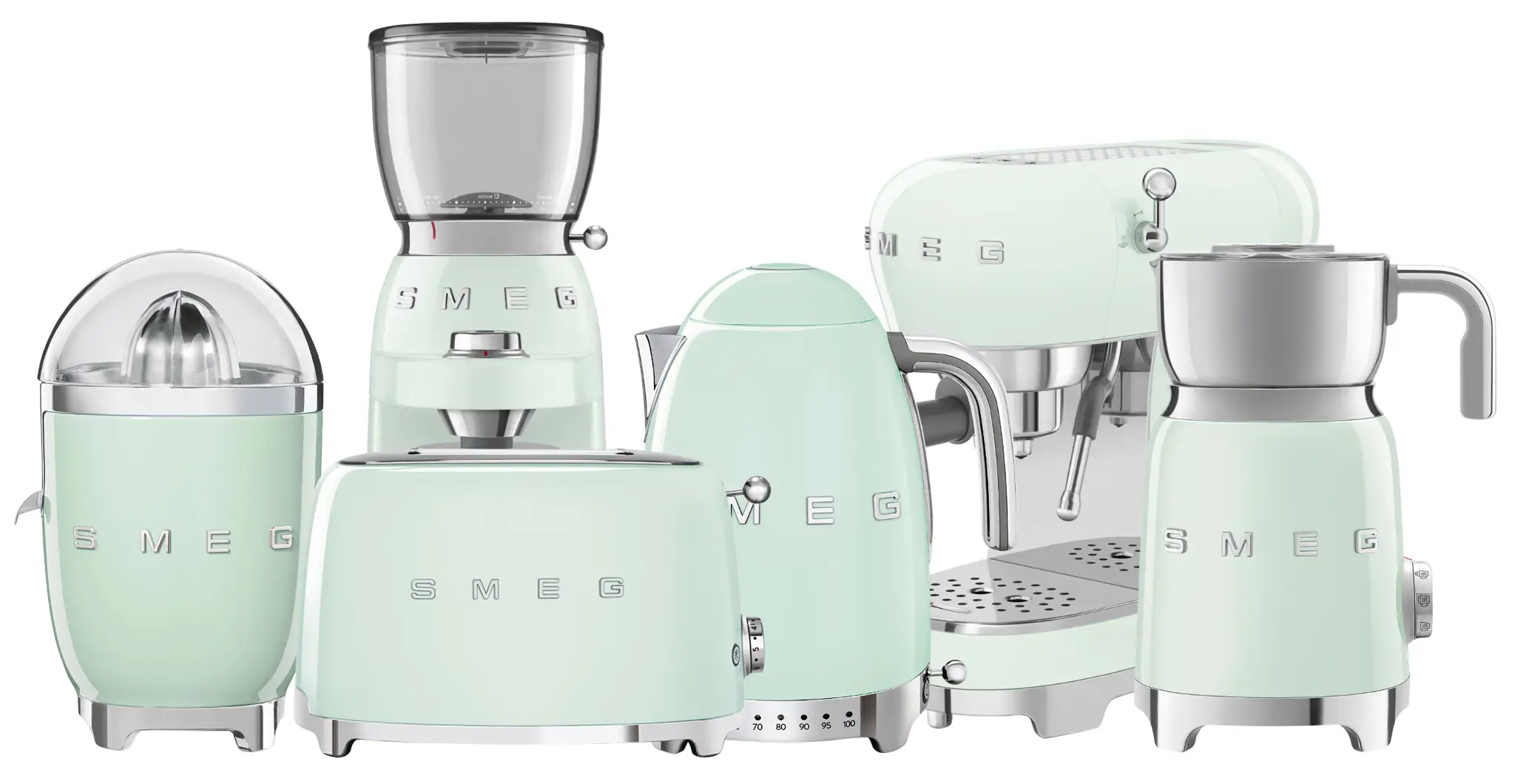 Oferowany zestaw produktów z linii 50’s Retro Style marki Smeg ułatwi przygotowanie codziennego śniadania z dodatkiem wyciskanego soku, spienionego mleka lub kawy ze świeżo mielonych ziaren. Wykonane z wysokiej jakości materiałów, m.in. tworzywa i stali nierdzewnej, urządzenia dzięki opływowym kształtom, chromowanym podstawom i pastelowemu zielonemu kolorowi wspaniale zaprezentują się na blacie kuchennym - można je więc będzie przechowywać na widoku, gdy akurat nie będą używane.