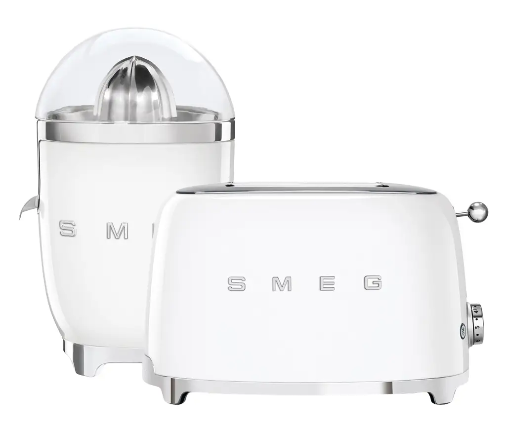 Prezentowany zestaw śniadaniowy produktów z linii 50’s Retro Style marki Smeg to doskonały duet ułatwiający przygotowanie porannego posiłku z dodatkiem świeżo wyciskanego soku. Wykonane z wysokiej jakości materiałów - m.in. tworzywa i stali nierdzewnej - urządzenia dzięki opływowym kształtom, chromowanym podstawom oraz neutralnemu białemu kolorowi elegancko zaprezentują się na blacie kuchennym, uzupełniając współczesne wystroje - można je więc będzie przechowywać na widoku, gdy akurat nie będą używane.