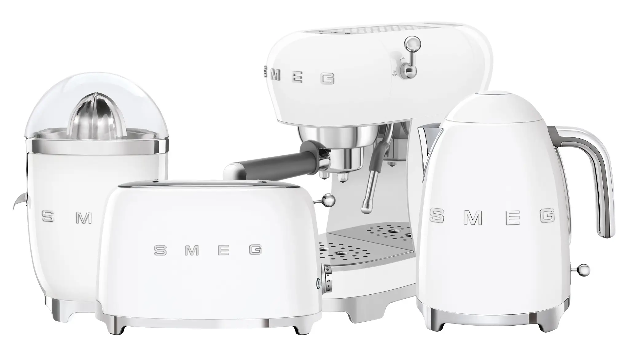 Oferowany zestaw produktów z linii 50’s Retro Style marki Smeg ułatwi przygotowanie codziennego śniadania z dodatkiem świeżego soku lub kawy. Wykonane z wysokiej jakości materiałów, m.in. tworzywa i stali nierdzewnej, urządzenia dzięki opływowym kształtom, chromowanym podstawom oraz neutralnemu, białemu kolorowi wspaniale zaprezentują się na blacie kuchennym - można je więc będzie przechowywać na widoku, gdy akurat nie będą używane.