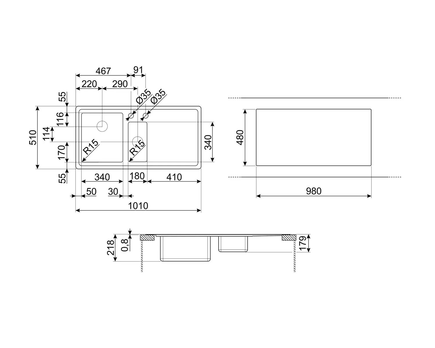 - Promień zaokrąglenia zlewozmywaka: 15 mm